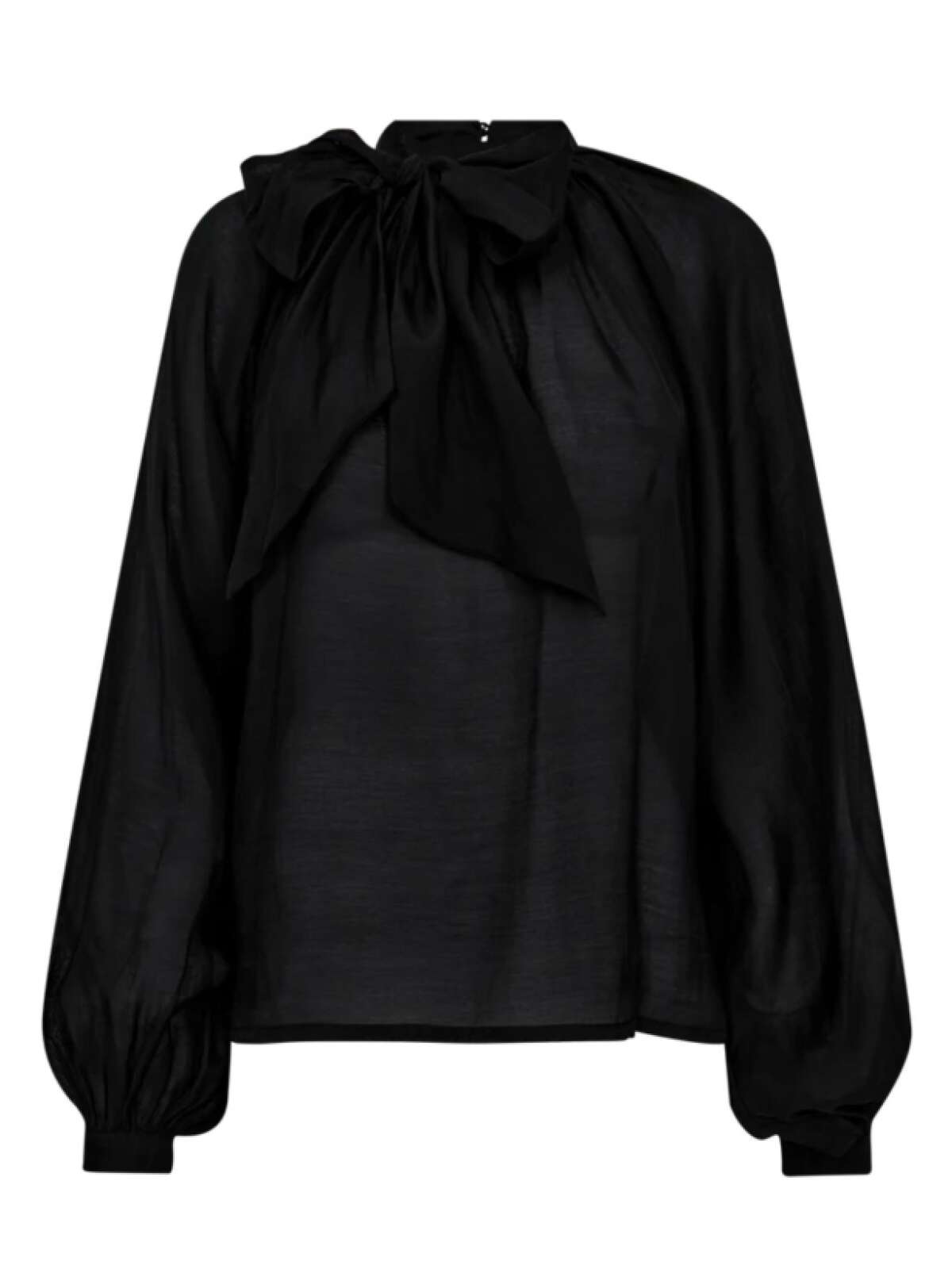 CMTILLY-BLOUSE er en elegant bluse i eksklusiv kvalitet med høj krave, lægdetaljer og lange raglanærmer med voluminøs balloneffekt. Den har knaplukning på ærmerne og en aftagelig sløjfedetalje, hvilket skaber en sofistikeret og løs pasform.