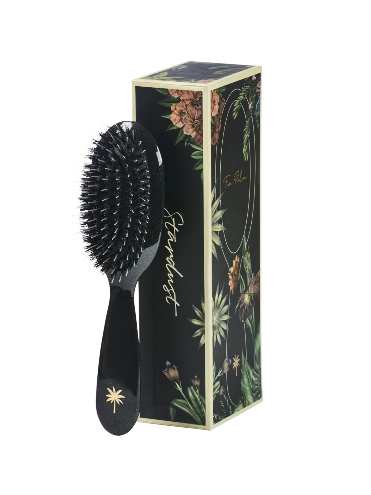 Small Hair Brush Stardust fra Fan Palm er en elegant og effektiv hårbørste, der kombinerer bløde vildsvinehår og fleksible nylonpigge. Sammen stimulerer de hovedbunden og fordeler hårets naturlige olier, så længderne efterlades glansfulde og velplejede. Den kompakte størrelse gør den perfekt til håndtasken og til daglig brug.