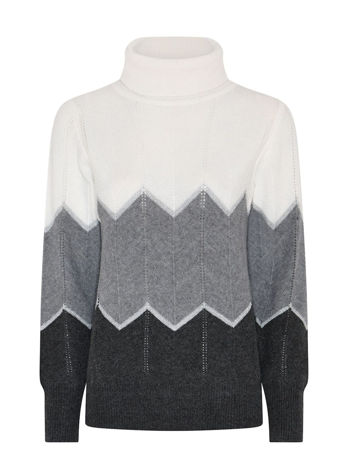 Raffineret strik fra MICHA med color bloch farver samt zig zag lurex effekt. Strikken har rullekrave samt lange ærmer med bred rib manchet og ribkant forneden.Længde: ca. 60 cm