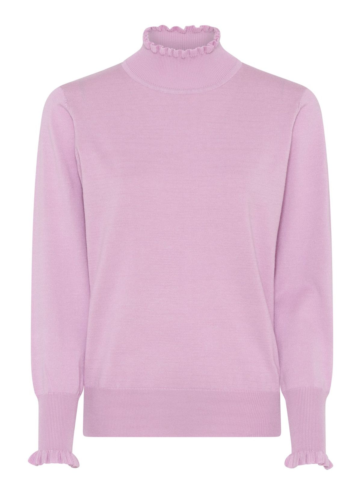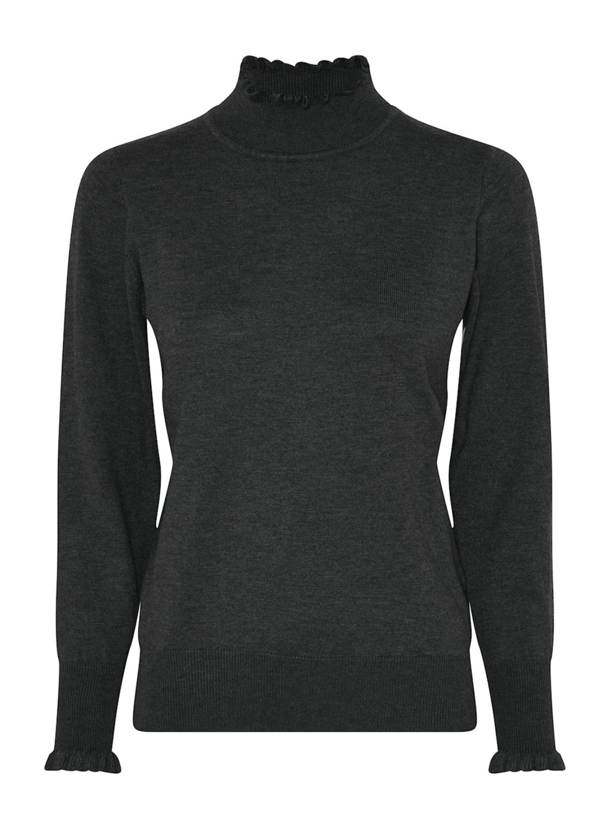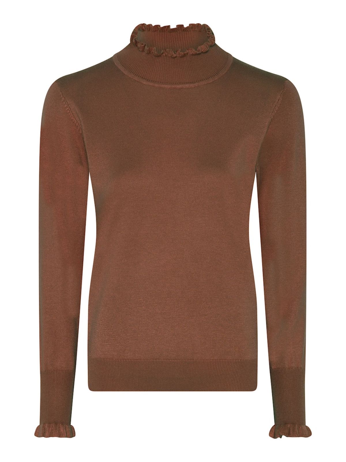Smart højhalset strik fra MICHA med bølgeeffekt på krave samt på manchetter. Strikken er i glat strik med lange ærmer og bred rib machet samt kant forneden.Længde: ca. 60 cm