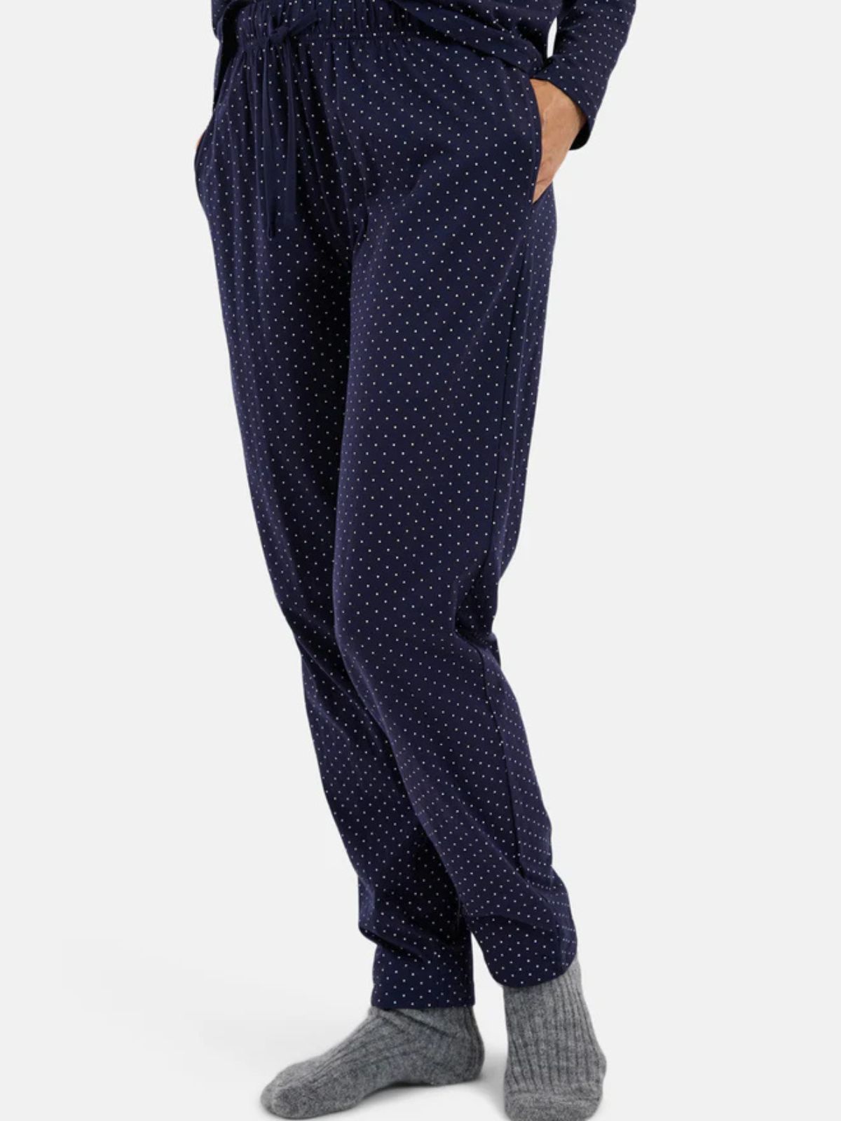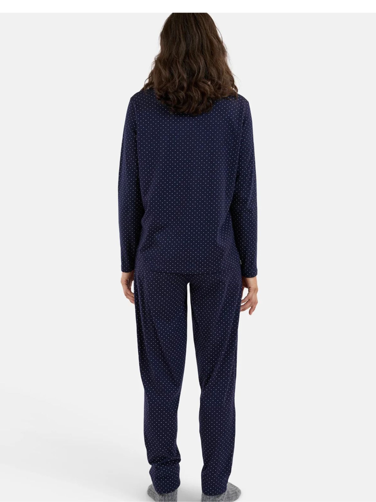 Elegant pyjamas fra BRANDTEX i en klassisk mørkeblå farve med små, fine prikker. Sættet består af en langærmet bluse med knapper i halsudskæringen og et par lange bukser med elastik og bindebånd i taljen for optimal komfort.
