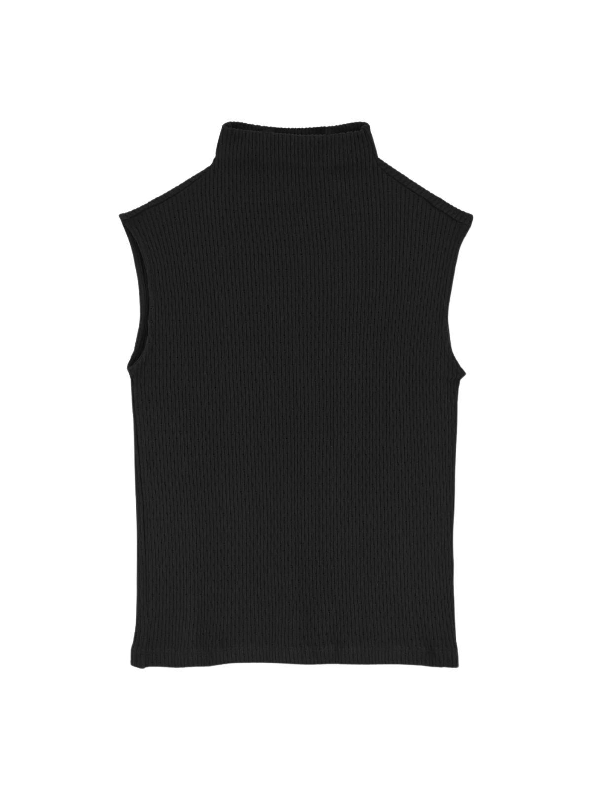 Eli top er en ærmeløs slim-fit top med høj hals i tekstureret jersey, der giver et sporty touch med dobbelt syning ved kant og let fremflyttet skuldersøm.