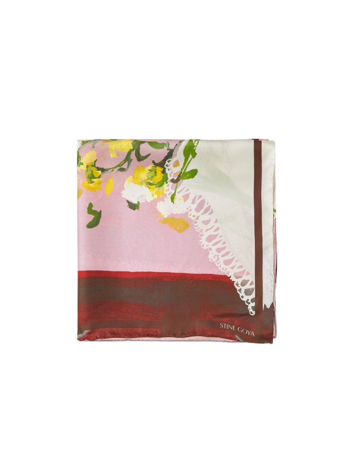 Silketørklæde med håndmalet stilleben, inklusiv blomster, bog og skål på lyserød baggrund. Indrammet af mørk kant og med diskret STINE GOYA-logo. Kan styles som halstørklæde, i håret eller som pynt på tasken.