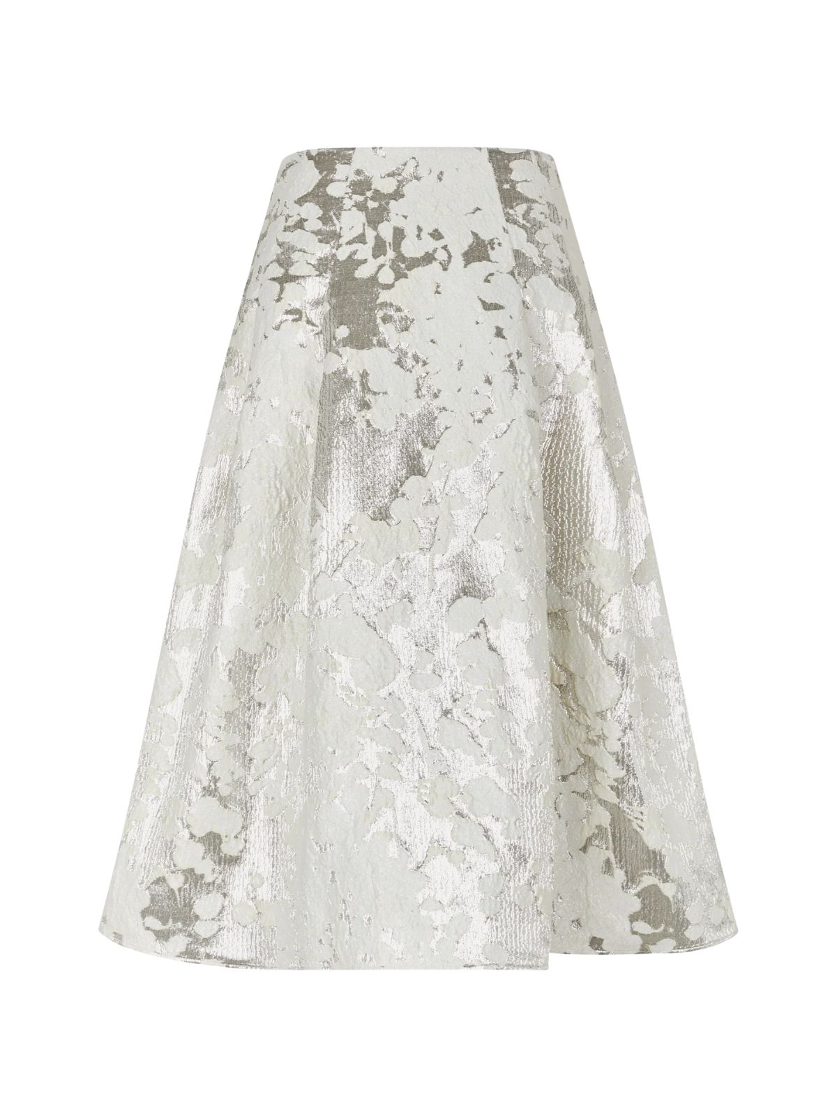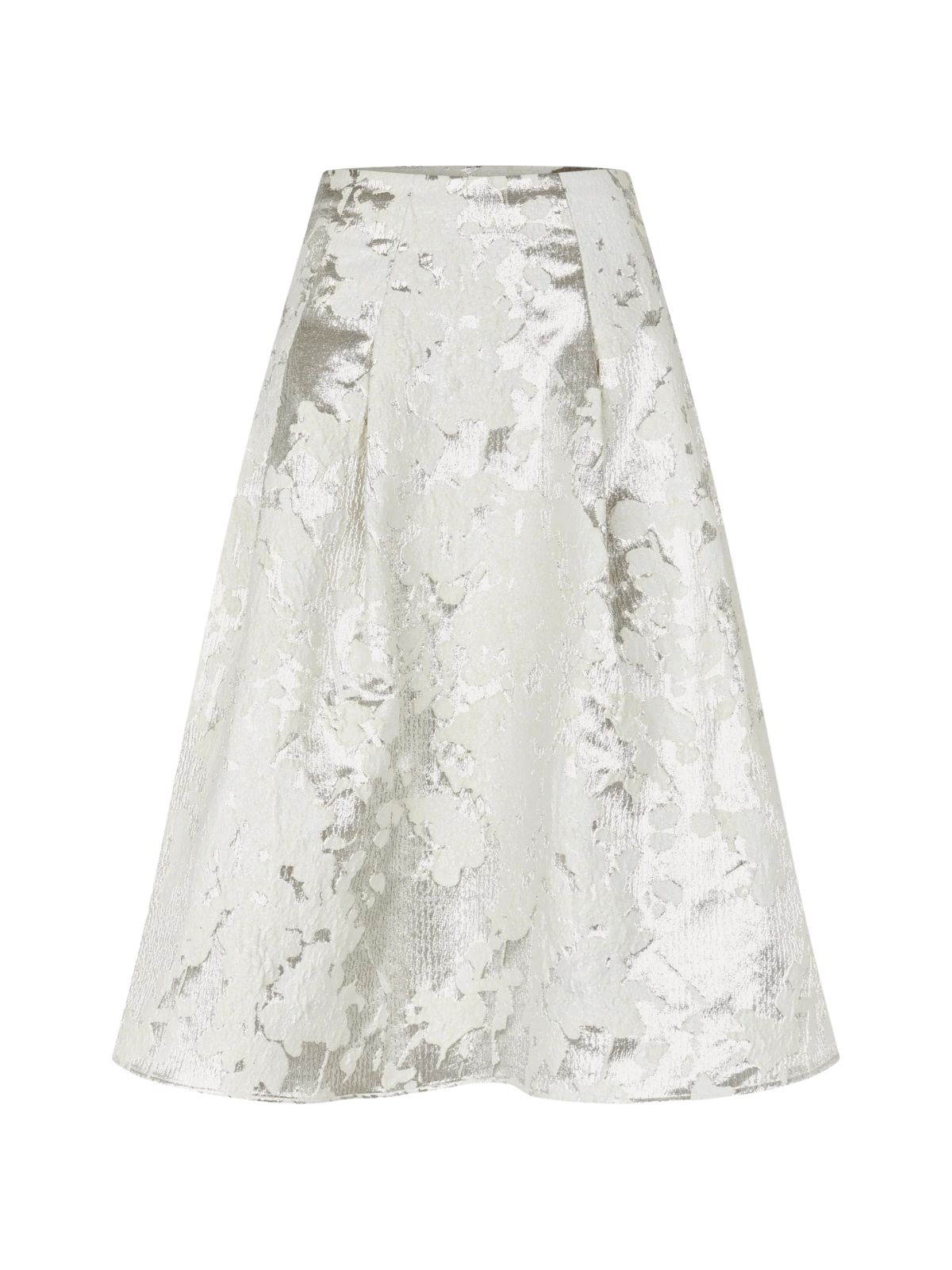 Ankellang nederdel i off-white og sølv med metallisk jacquardvævning og abstrakt blomstermønster. Nederdelen har læg for ekstra volumen, fast linning og sidelommer.