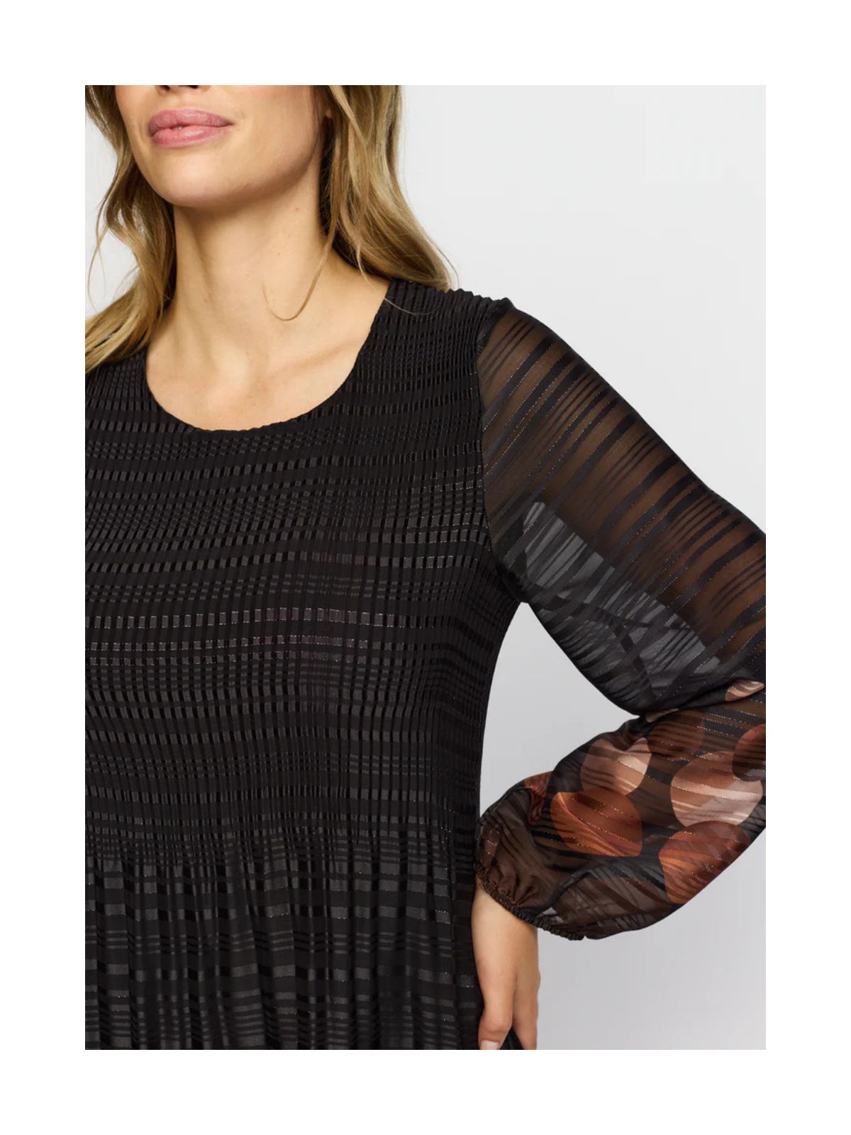 Smuk og elegant plissé kjole fra 2 BIZ med ballonærmer med elastik, der giver et feminint og let udtryk. Perfekt til både hverdagsbrug og festlige anledninger.Pasform: Regular