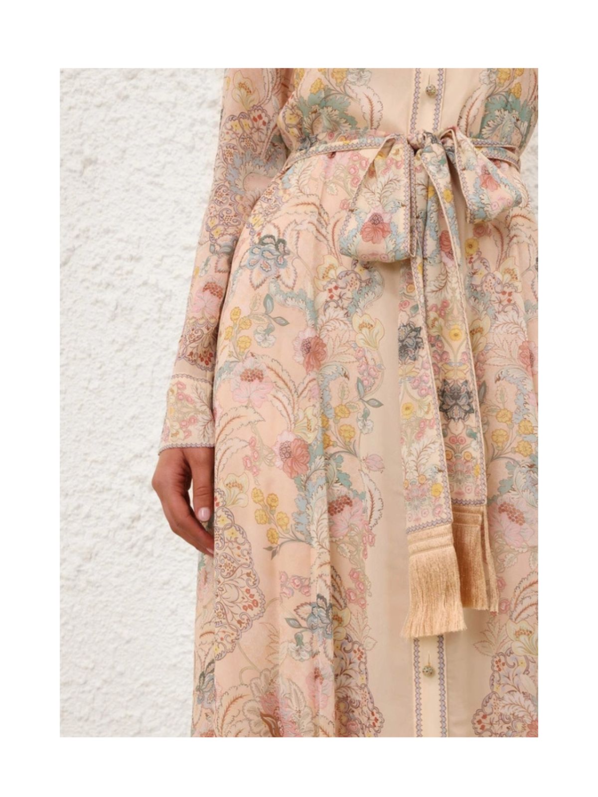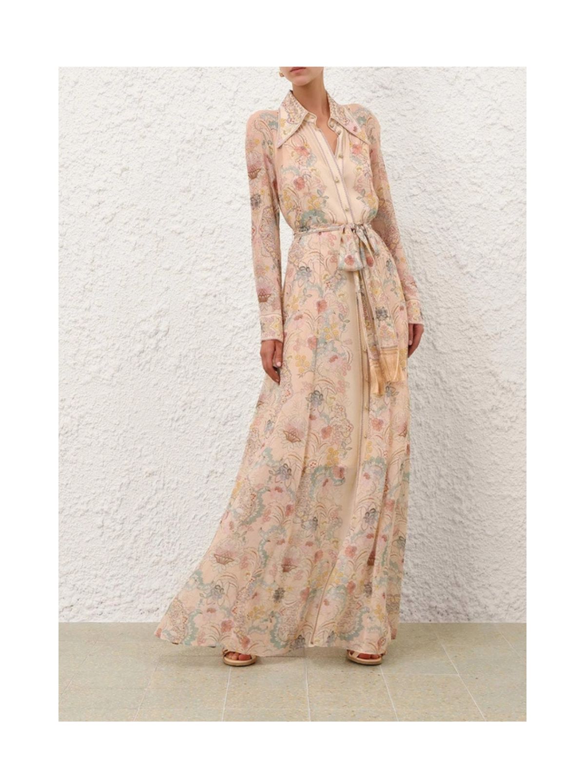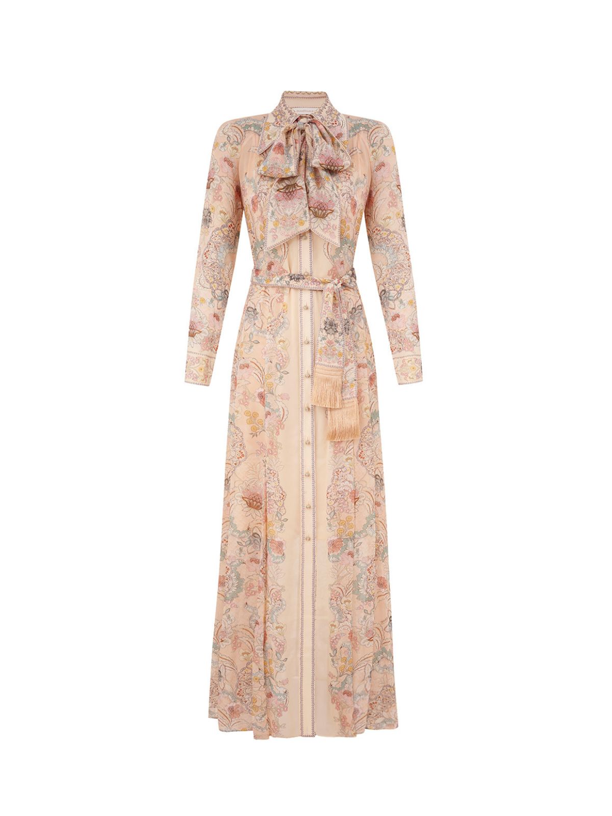 Eksklusiv Rebellion Pussybow kjolen fra ZIMMERMANN i pink blomsterprint i Twisted Romance. Kjolen er en langærmet maxikjole med en klassisk krave med pussybow-udskæring med lange flipper og smukke knapper ned langs midten foran. Kjolen har et løst bindebælte med fine guld frynser samt tilhørende underkjole.Pasform: Løs siddende