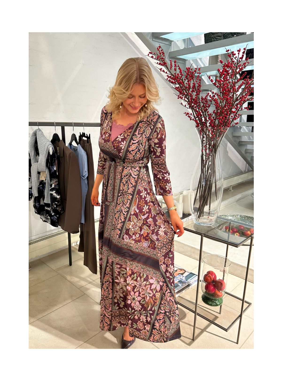 En elegant lang kjole med et smukt, levende mønster, der giver et feminint og iøjnefaldende udtryk. Kjolen har et justerbart bindebånd i taljen, som gør det muligt at skabe den pasform, der klæder dig bedst. Det lette materiale falder flot langs kroppen og gør kjolen perfekt til både hverdag, fest og feriedage.