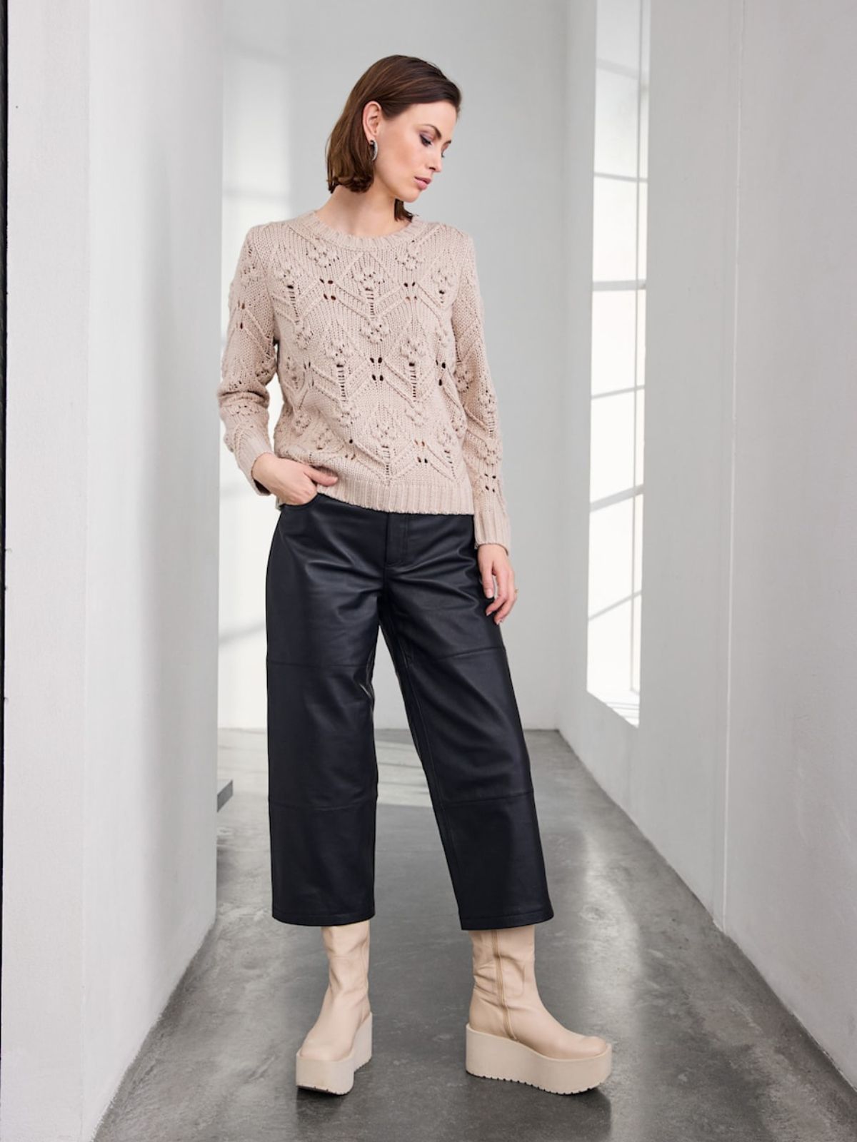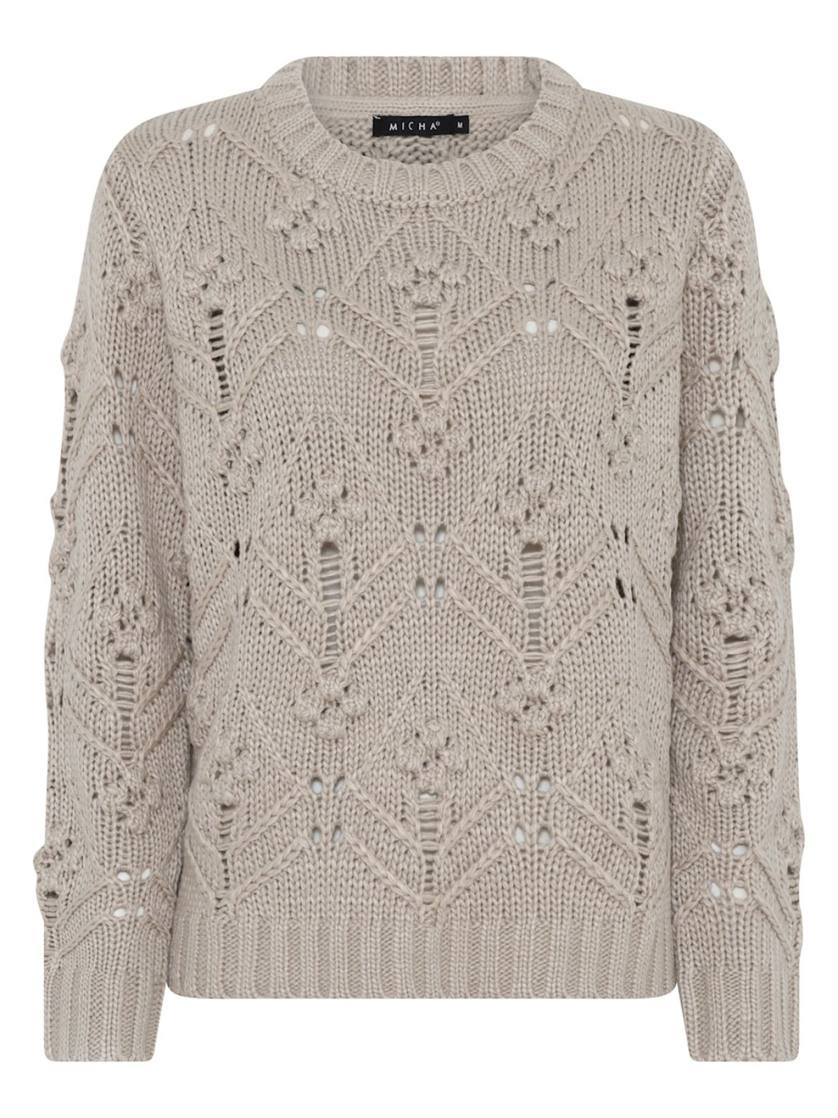 Elegant strik fra Micha med spændende hulmønster. Strikken hat rund hals med ribkant samt lange ærmer med ribkant ligeså nederste kant.Længde: ca. 60 cm