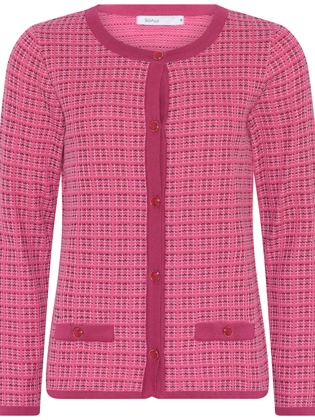 Elegant Skovhuus cardigan i strukturstrik med ternet mønster-. Kanterne ved halsen og åbningen er ketlet, så der kommer en flot afslutning, der understreger den høje kvalitet. Knapperne er simple med en lille guldkant, som giver et vintage look. Lommeeffekten giver denne cardigan et jakkelook.Længde: ca. 60 cm