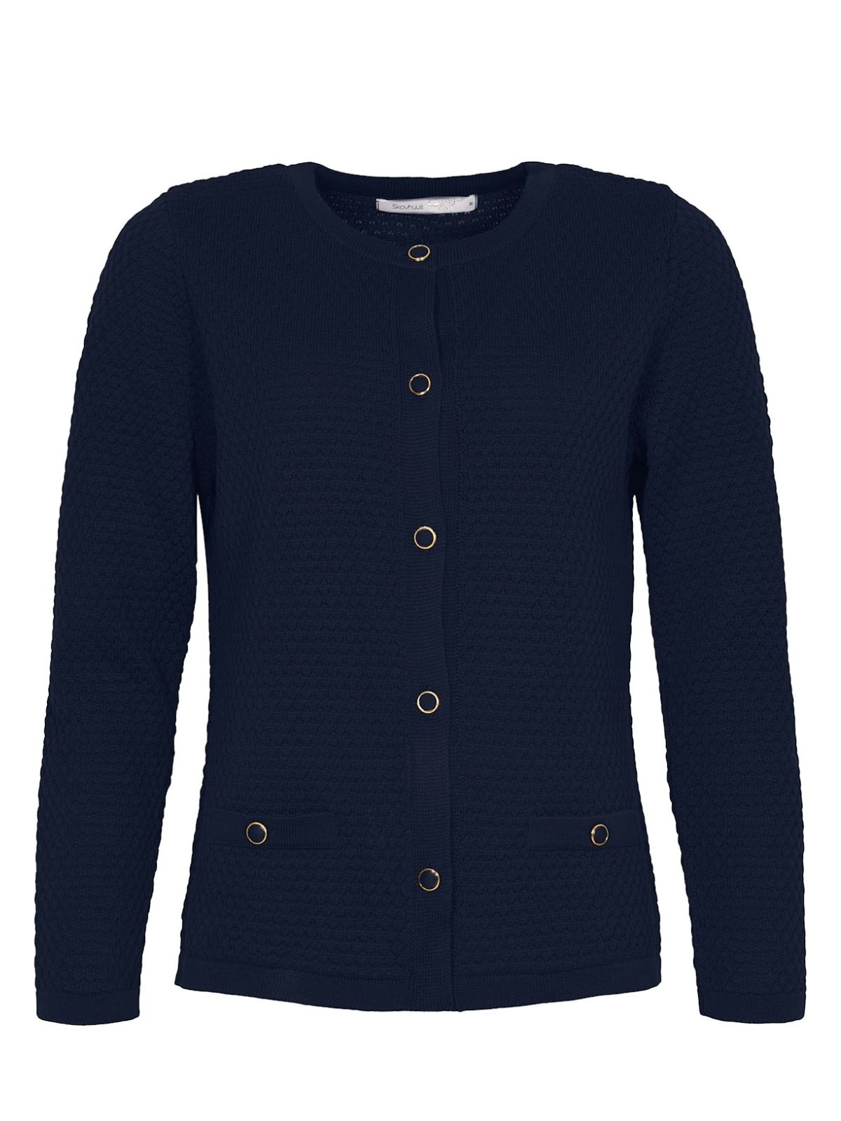Elegant Skovhuus cardigan i sømandsstrik, hvor der er kælet for detaljen. Den flotte struktur med "sømandsbobler" giver et tidløst look, som kan styles til både hverdag og fest. Kanterne ved halsen og åbningen er ketlet, det understreger den høje kvalitet. Knaplukning med en lille guldkant, som giver et vintage look samt lommeeffekten giver et jakkelook, så du kan sagtens bruge den som en fin jakke om sommeren og til indendørs arrangementer.Længde: ca 60 cm