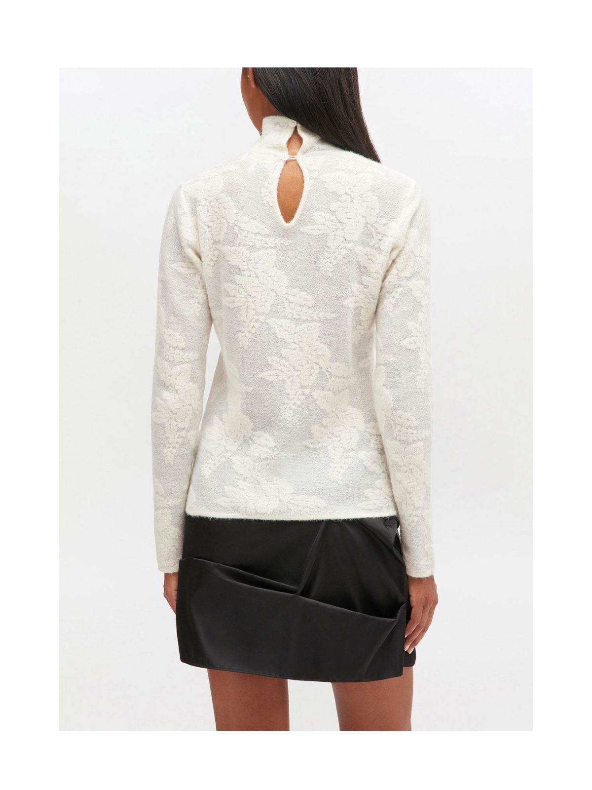 Elegant rullekravebluse med gennemsigtigt blomsterprint, høj hals og lange ærmer. Perfekt til lag-på-lag eller som statement under jakker og cardigans.Materiale: 39% Alpaca, 30% Polyamide, 16% Wool, 15% Recycled Polyamide