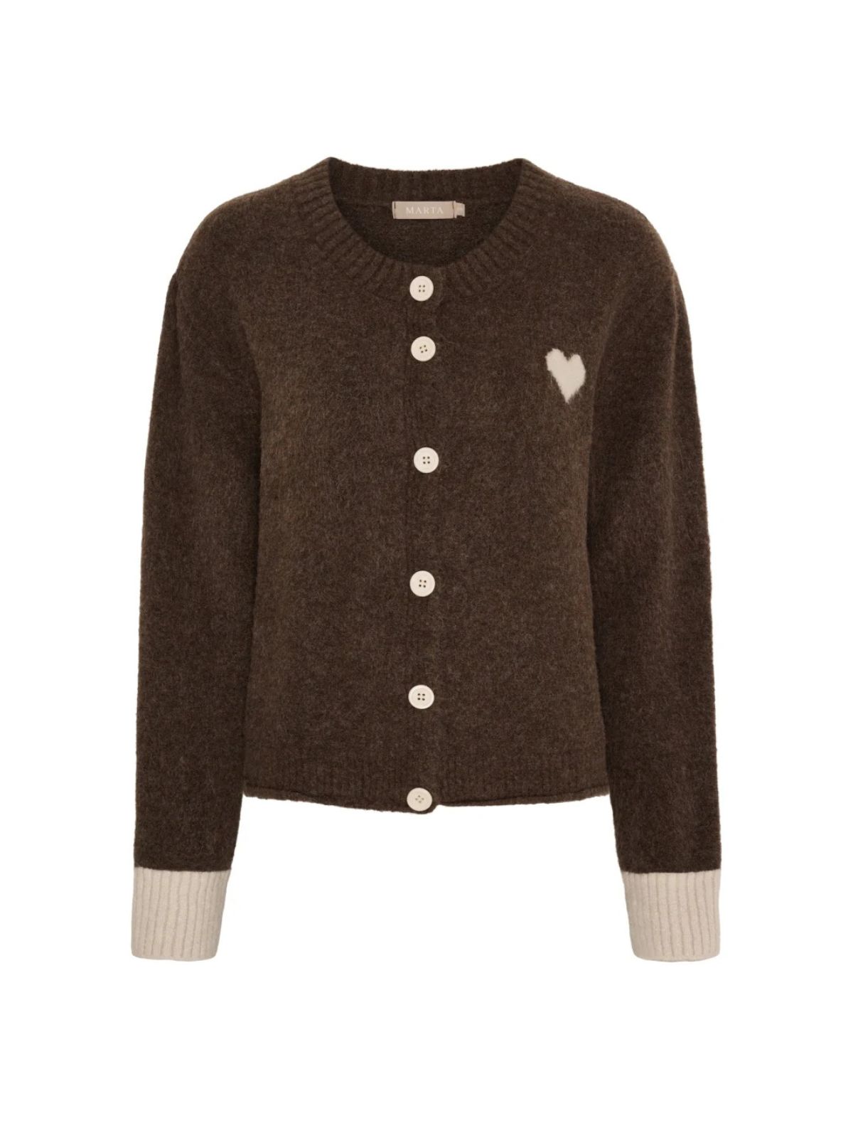 Skøn cardigan fra Marta Du Chateau i feminint design med rund hals. knaplukning samt hjerte logo på venstre bryst og lyse manchetter.Længde: ca. 60 cm