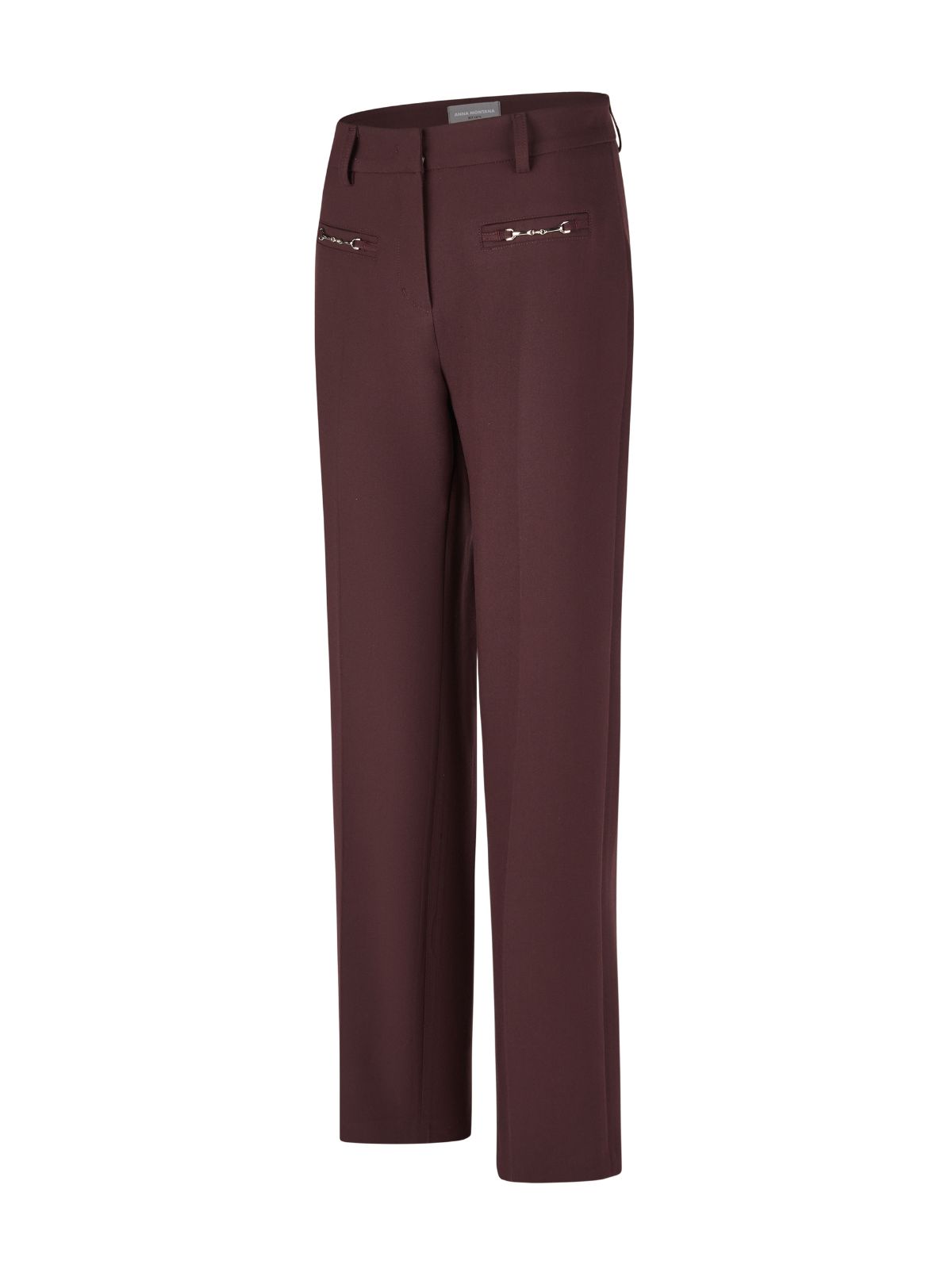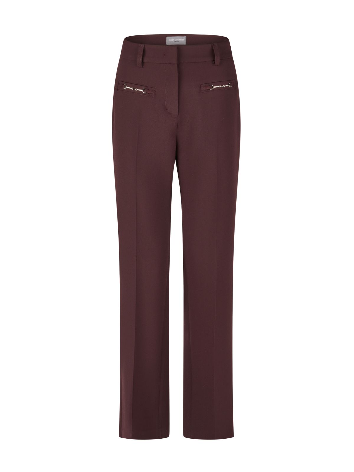 Elegante bukser i bordeaux med brede ben og fine spænde-detaljer ved lommerne. Blød og behagelig kvalitet, der kombinerer komfort med et stilfuldt udtryk.
