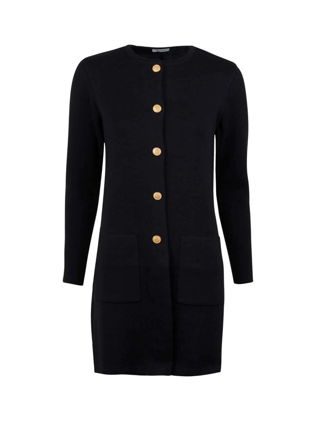 Lang cardigan i blød merinould med praktiske lommer og gyldne S-knapper foran og på ærmerne. Perfekt som et elegant alternativ til blazer – style den over en hvid skjorte og jeans for et klassisk look.