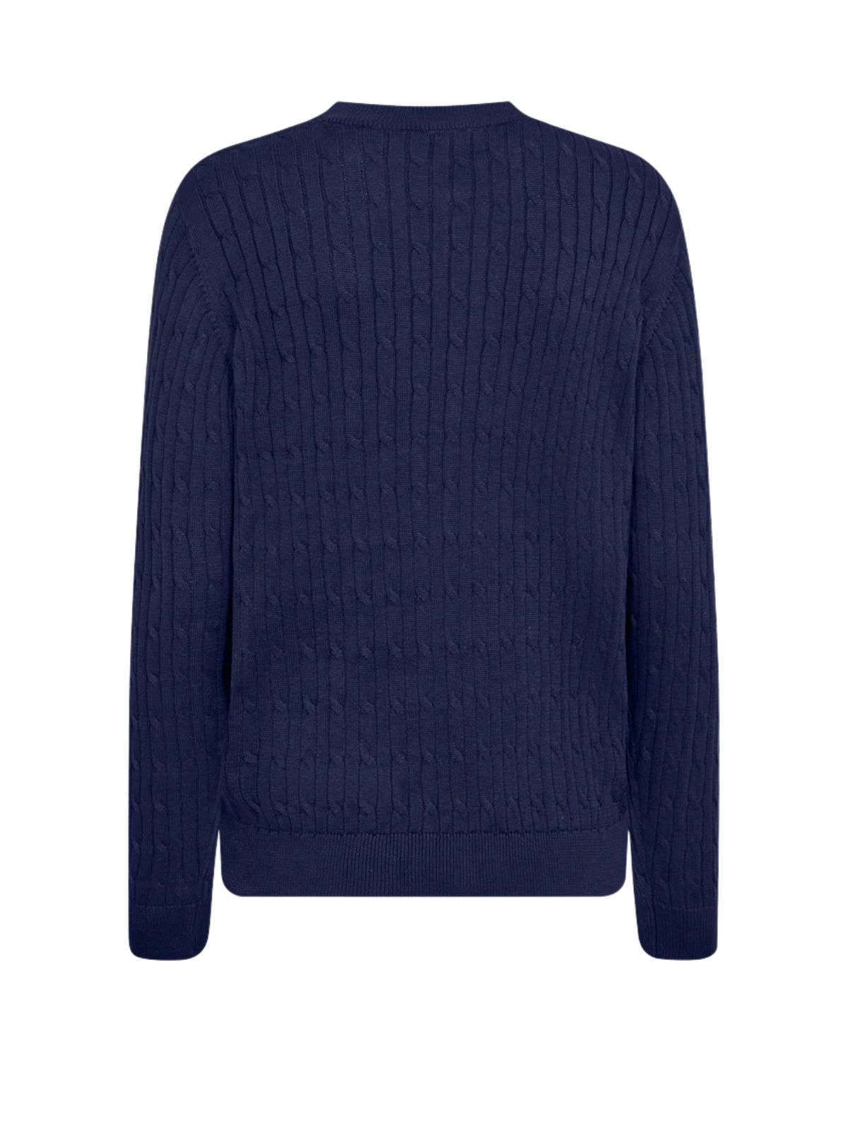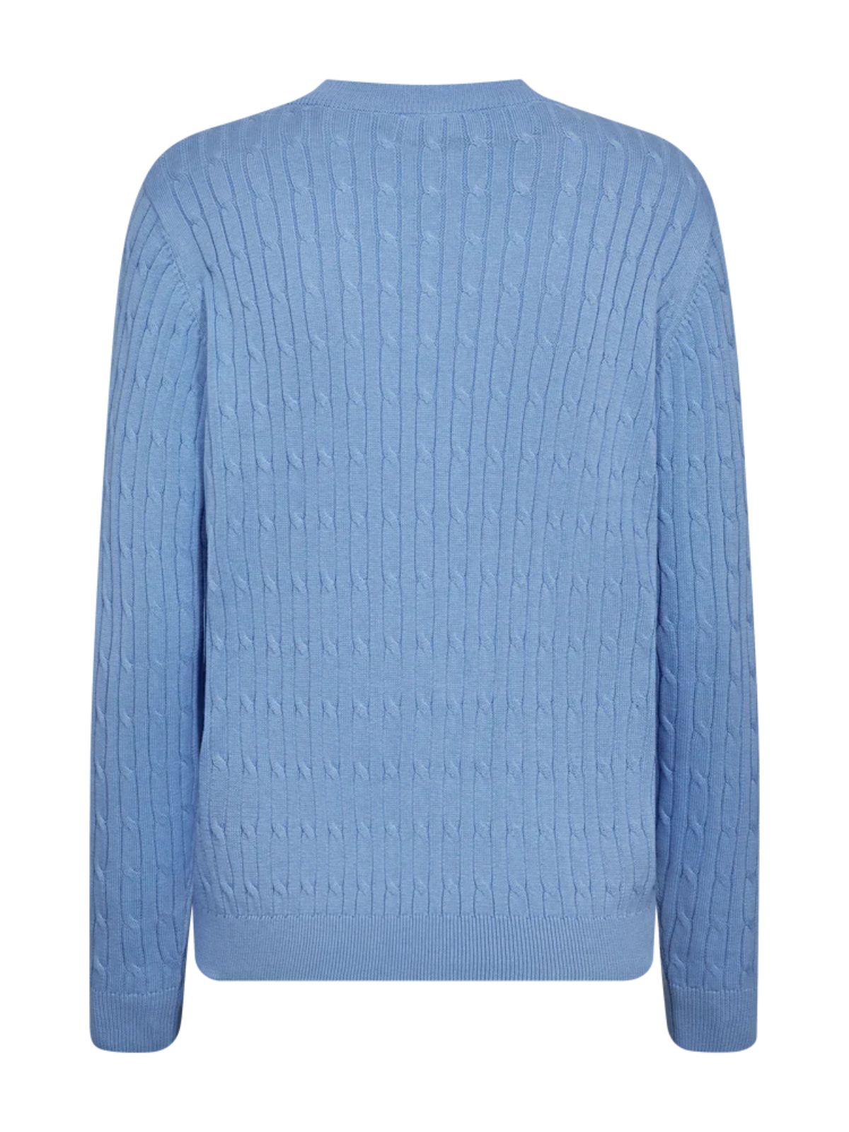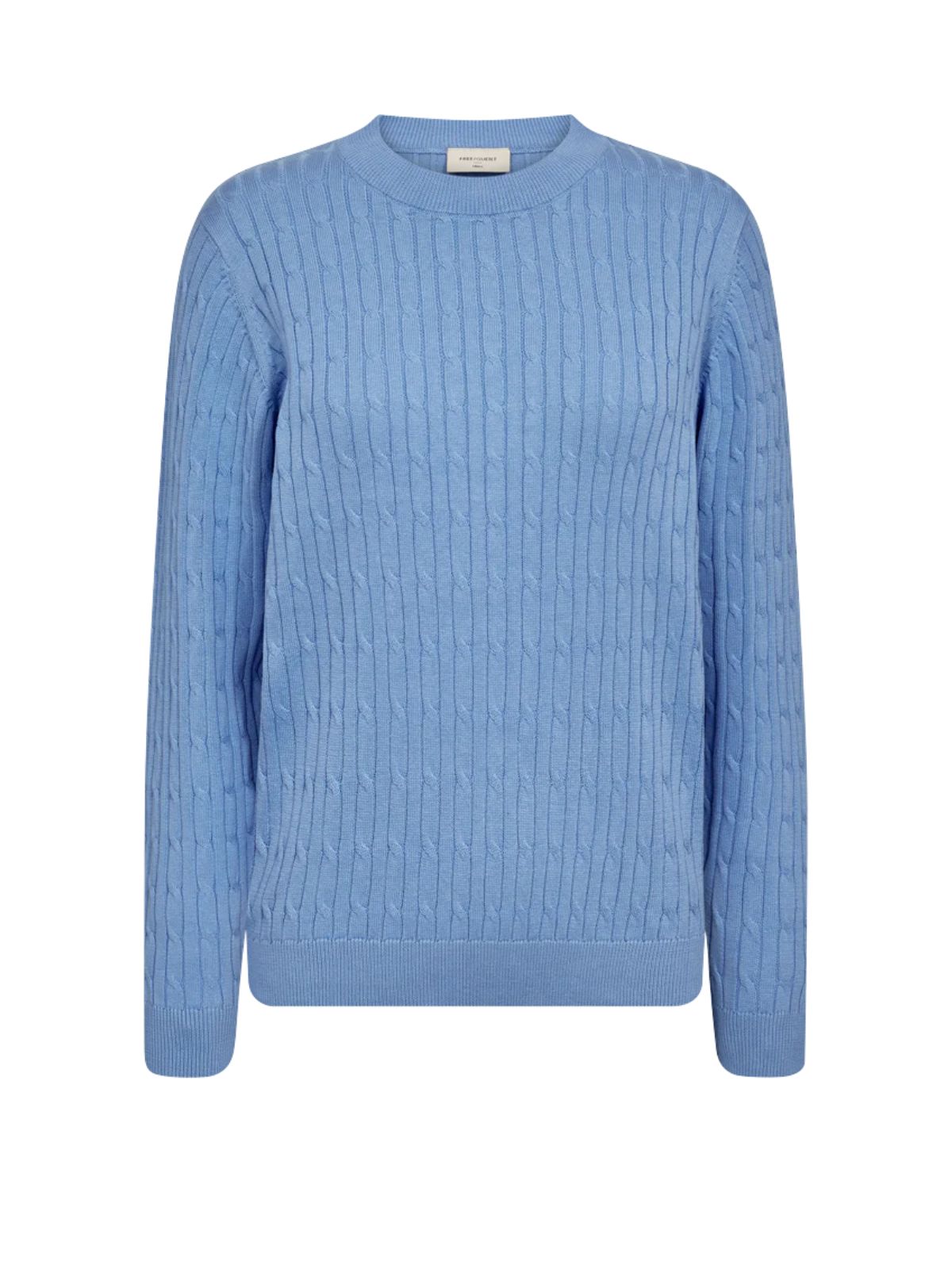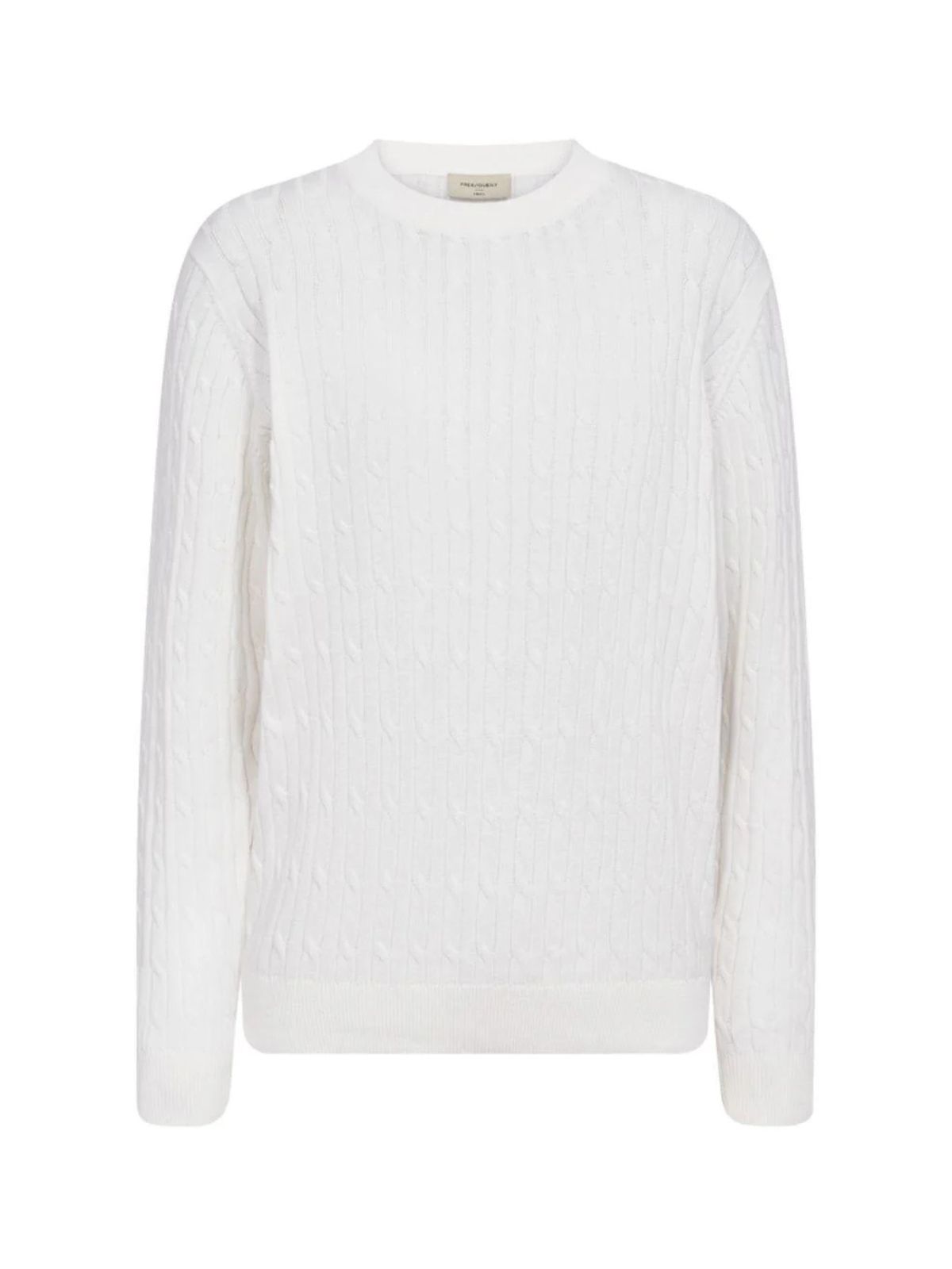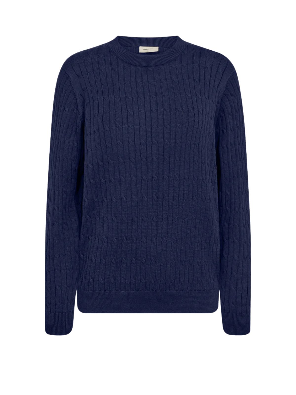 Pullover fra Freequent i en blød, finstrikket kvalitet med elegant kabelstrikket mønster. Modellen har lange ærmer, rund halsudskæring og ribkanter, hvilket giver et klassisk og tidløst udtryk.Materiale: 100% økologisk bomuld