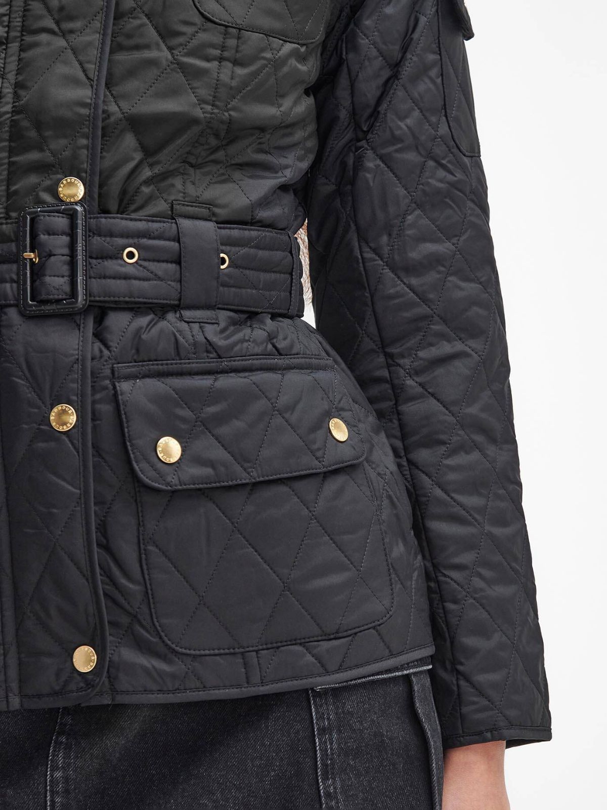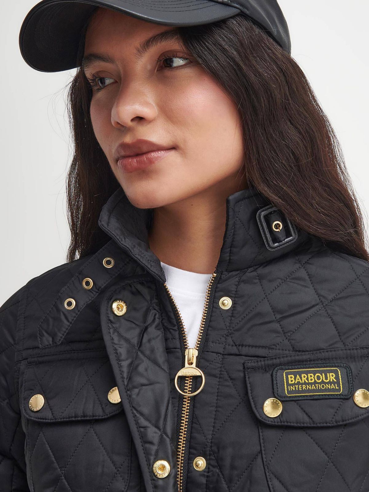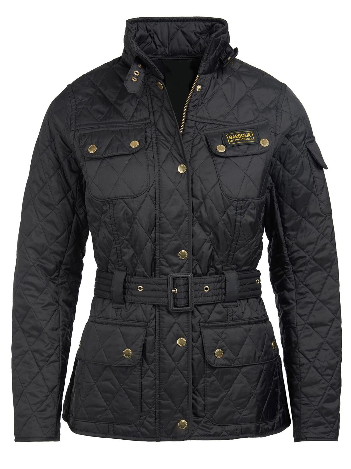 Raffineret og quiltet jakke fra Barbouri International-design i et normalt fit og med et diamantquiltet yderstykke. Fire lommer med nitter, en tragtkrave med halsrem, en ærmelomme og skulderlapper bevarer det autentiske bikerjakke-look, mens et spændelukningsbælte skaber en flatterende silhuet.Længde: ca. 75 cm