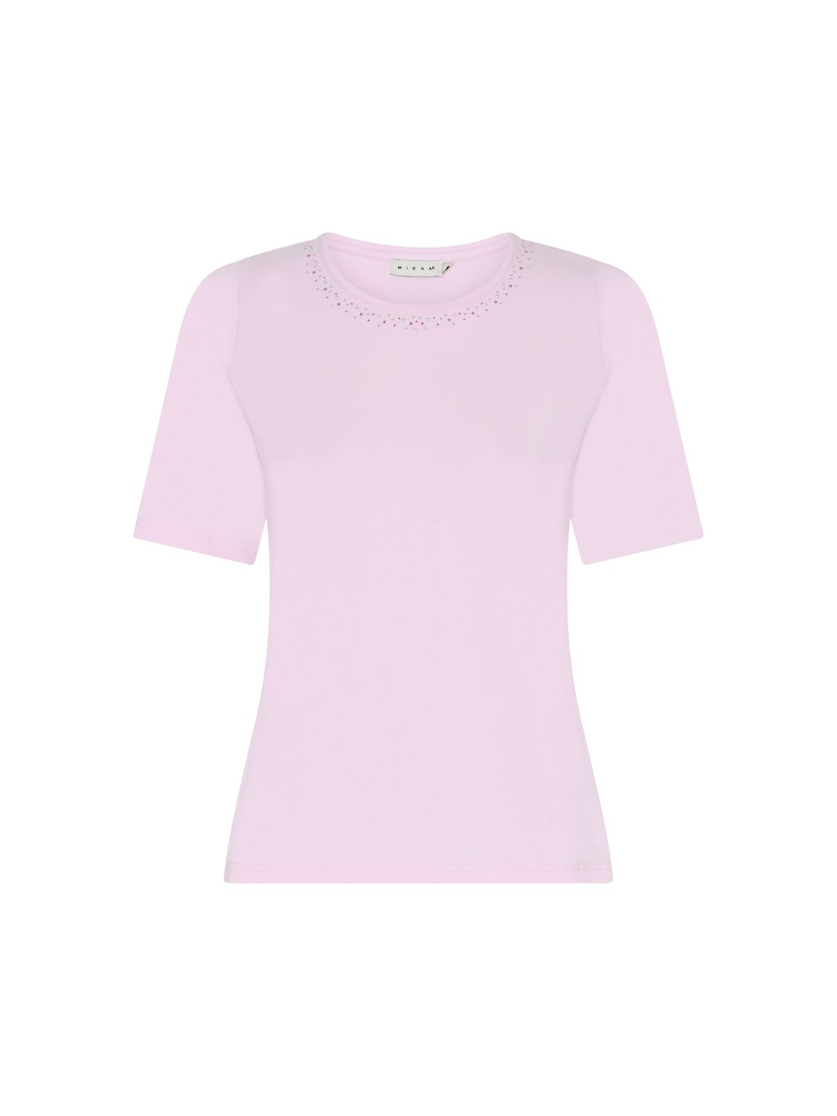 Denne T-shirt er fremstillet i en blød og strækbar kvalitet med modal, bomuld og elastan, som giver høj komfort og en behagelig pasform. Materialet føles let mod huden, mens rhinstenene ved kraven tilfører et elegant og feminin touch, der løfter det enkle design. En alsidig T-shirt, der nemt kan styles både til hverdag og mere festlige anledninger.