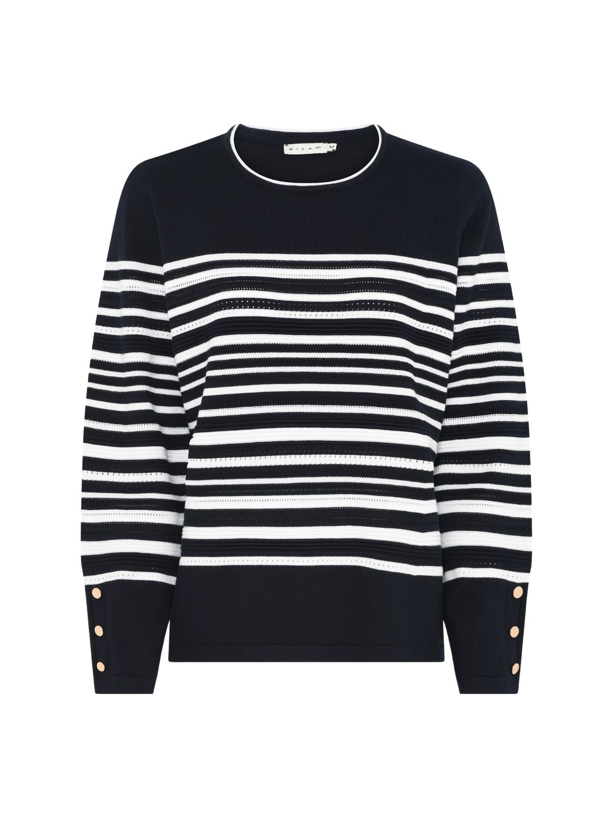 Denne strik er lavet i en blød og behagelig kvalitet med en flot stribet detalje og guld accenter ved ærmet, som giver et elegant og moderne udtryk. Materialet føles let og smidigt mod huden, og designet gør strikken både stilfuld og nem at kombinere til hverdag eller mere pæne looks.Længde: ca. 60 cm