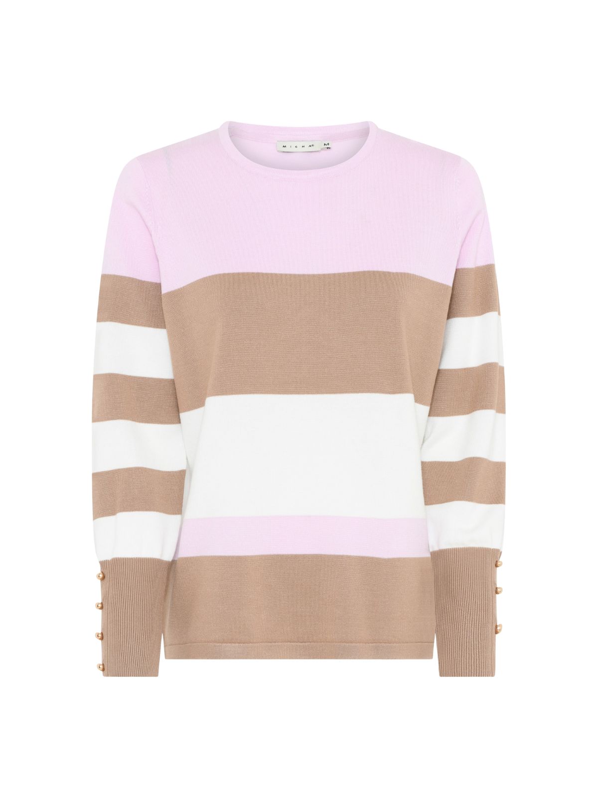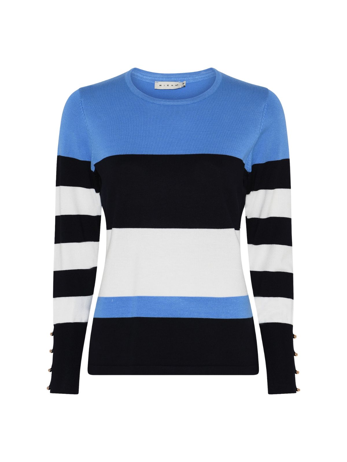 Denne strik er lavet i en blød og behagelig kvalitet med en flot stribet detalje og guld accenter ved ærmet, som giver et elegant og moderne udtryk. Materialet føles let og smidigt mod huden, og designet gør strikken både stilfuld og nem at kombinere til hverdag eller mere pæne looks.