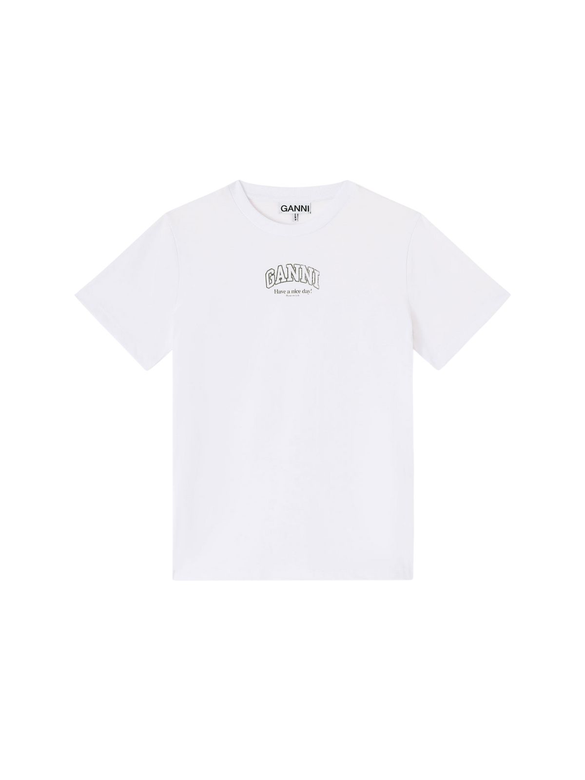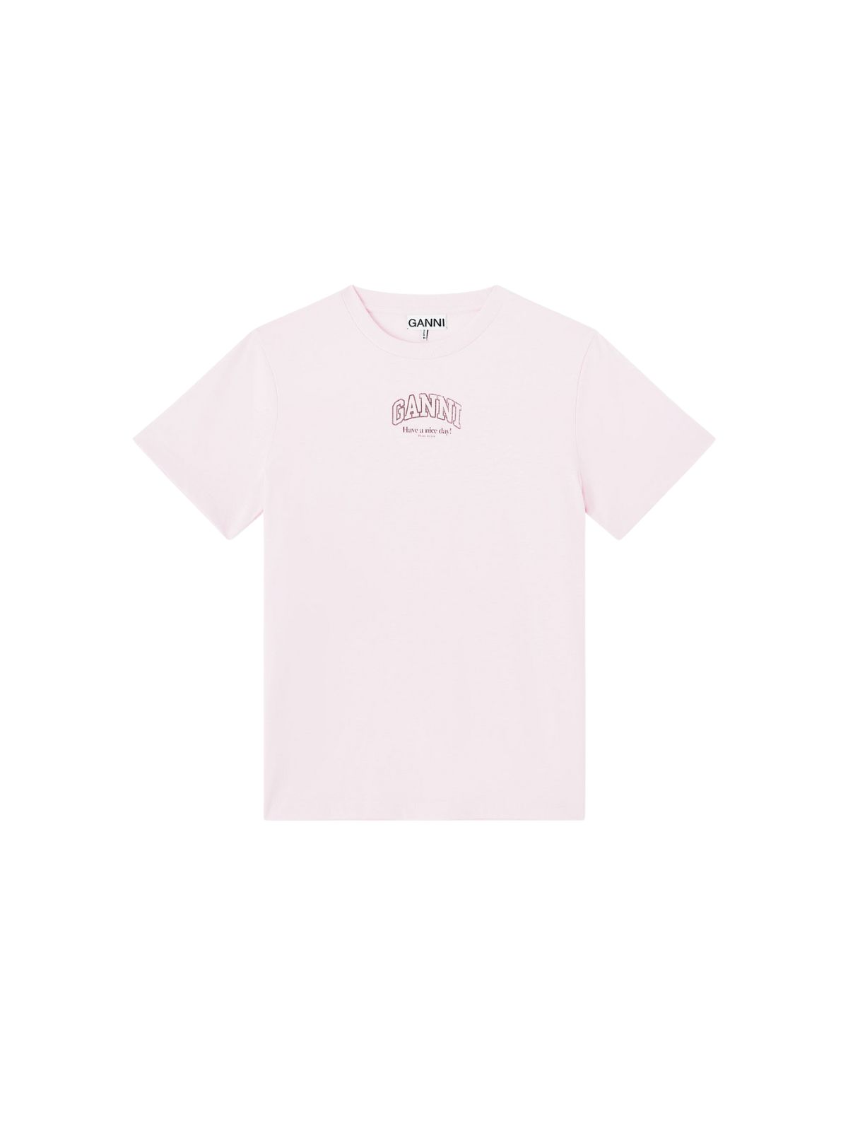 Denne T-shirt fra GANNI er et tidløst og alsidigt basisitem, der passer perfekt til både hverdag og layering. Den runde halsudskæring og de korte ærmer giver et klassisk snit, mens det diskrete GANNI-logo tilfører et subtilt, genkendeligt præg. T-shirten er fremstillet i blød økologisk bomuld, som sikrer komfort og en behagelig pasform hele dagen.