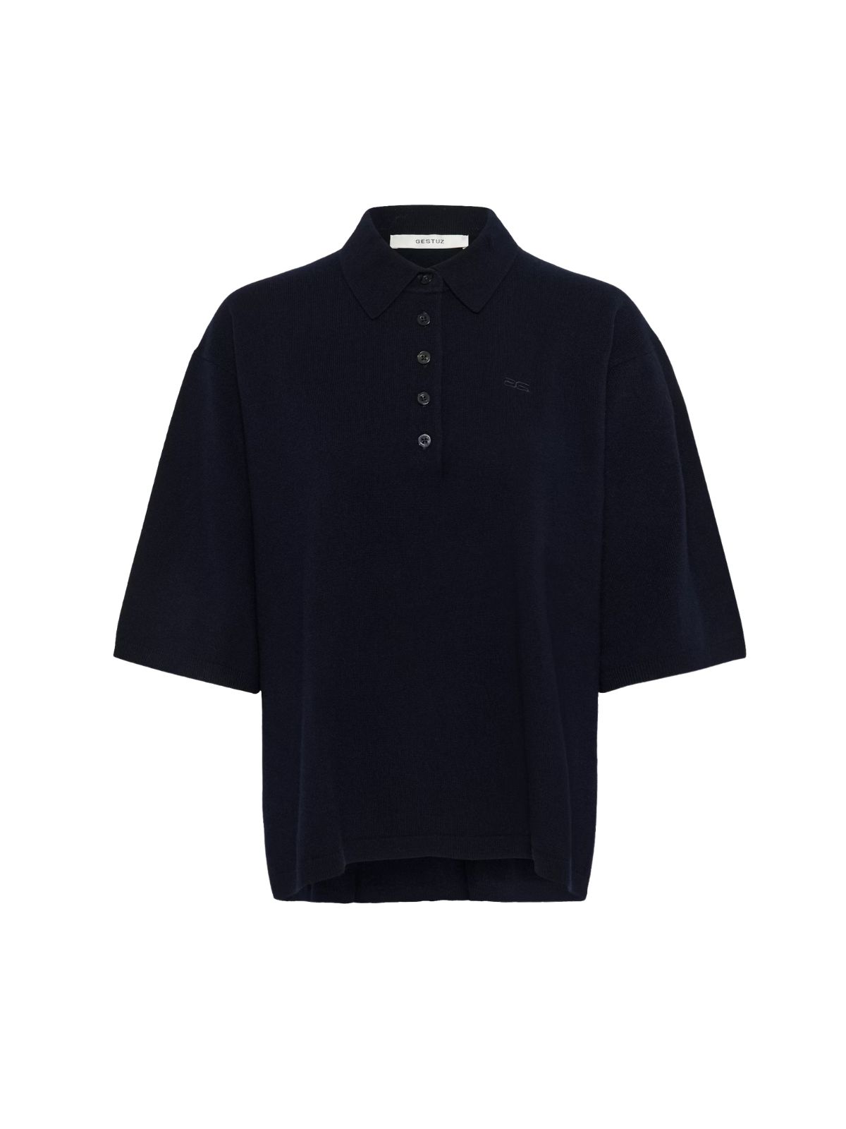 Poloshirt i 100% certificeret uld med løstsiddende, boxy pasform og faldne skuldre. Den klassiske krave, fem-knaps stolpe og brede albuelange ærmer giver et afslappet og stilfuldt udtryk.