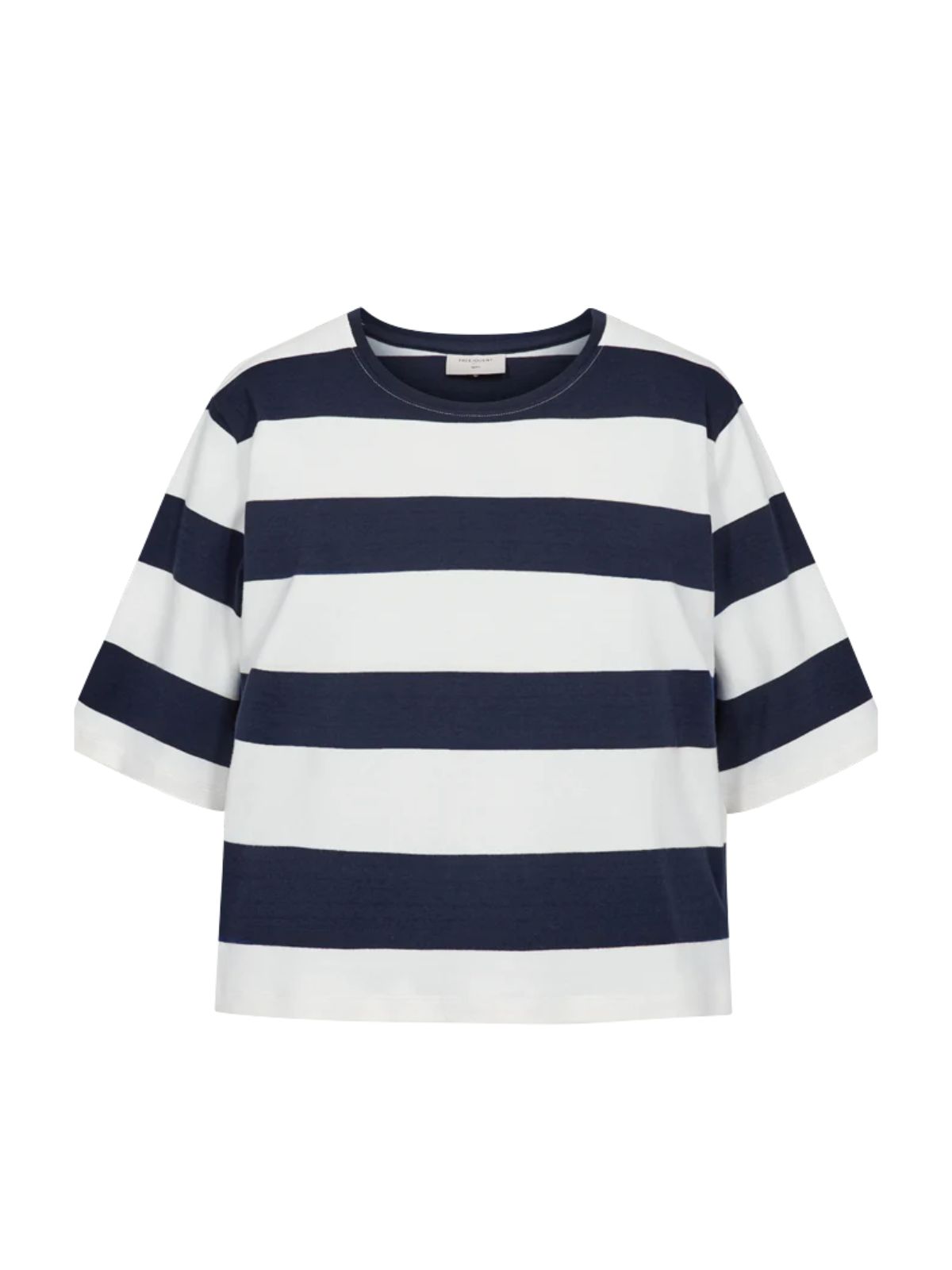 T-shirt fra Freequent i en blød og behagelig kvalitet med brede trekvartærmer og rund halsudskæring. De fine slidser i siderne og den løse pasform giver et afslappet og moderne udtryk.