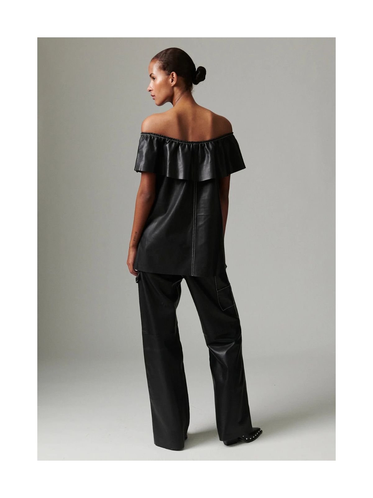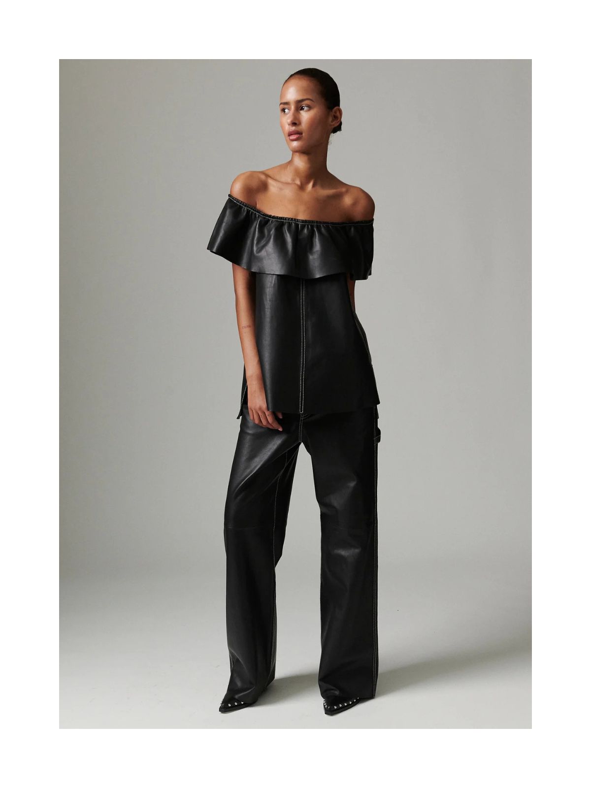 Disse bukser i blødt og smidigt lammeskind har et enkelt, straight fit, der giver et elegant og tidløst udtryk. Den rene silhuet skaber en smuk balance mellem kant og eksklusivitet og matcher perfekt den off-shoulder lædertop for et gennemført look.