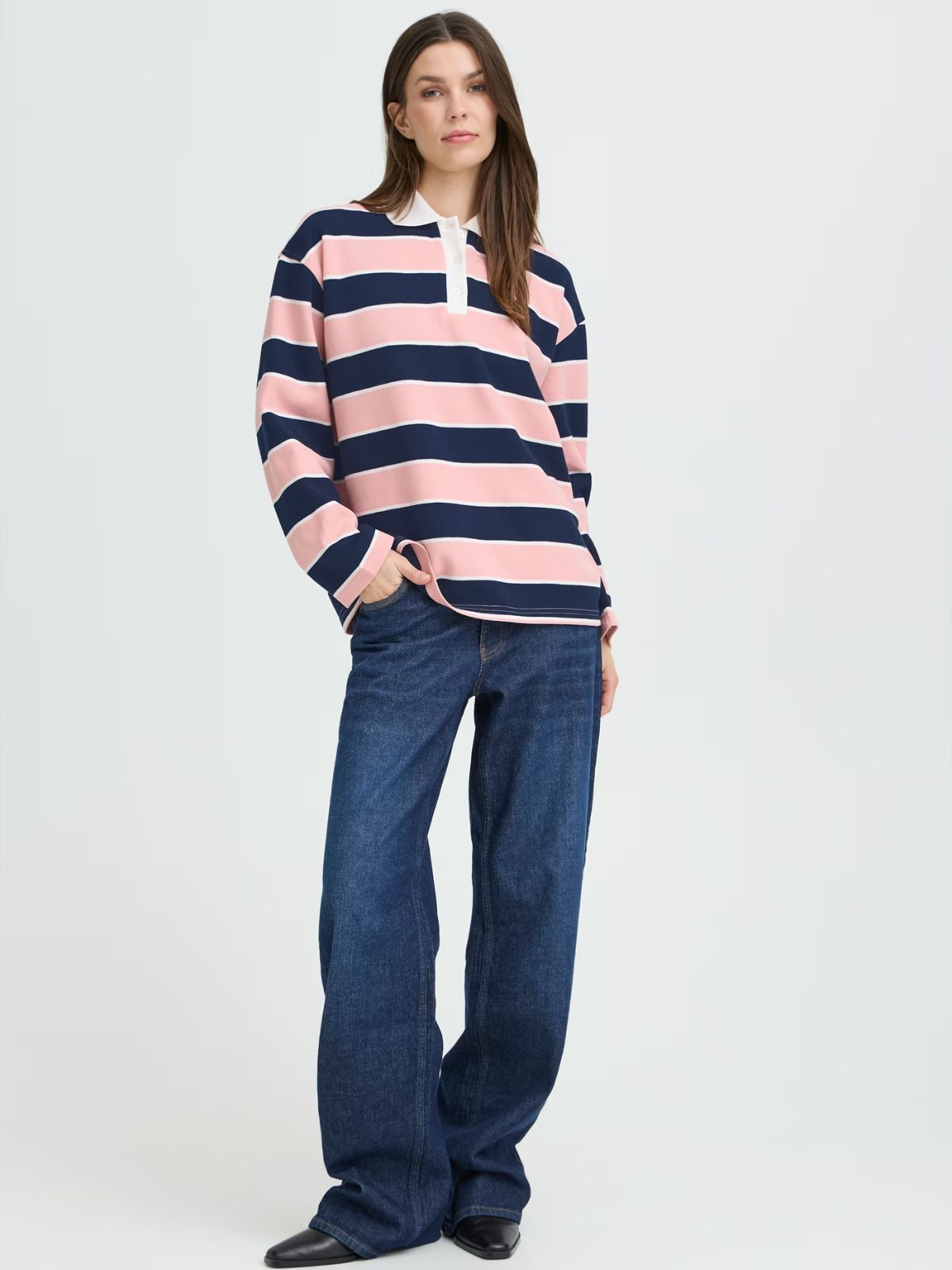 Sporty rugby bluse fra PULZ i flotte farver og striber. Blusen har klassisk krave og knaplukning, dropskuldre samt lange ærmer og et lige snit.