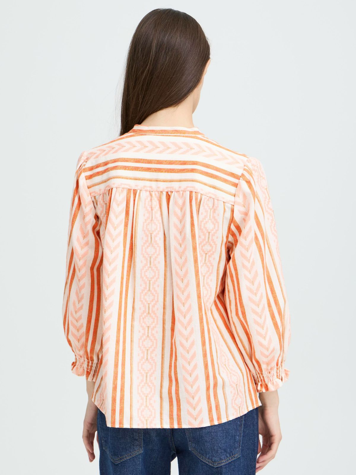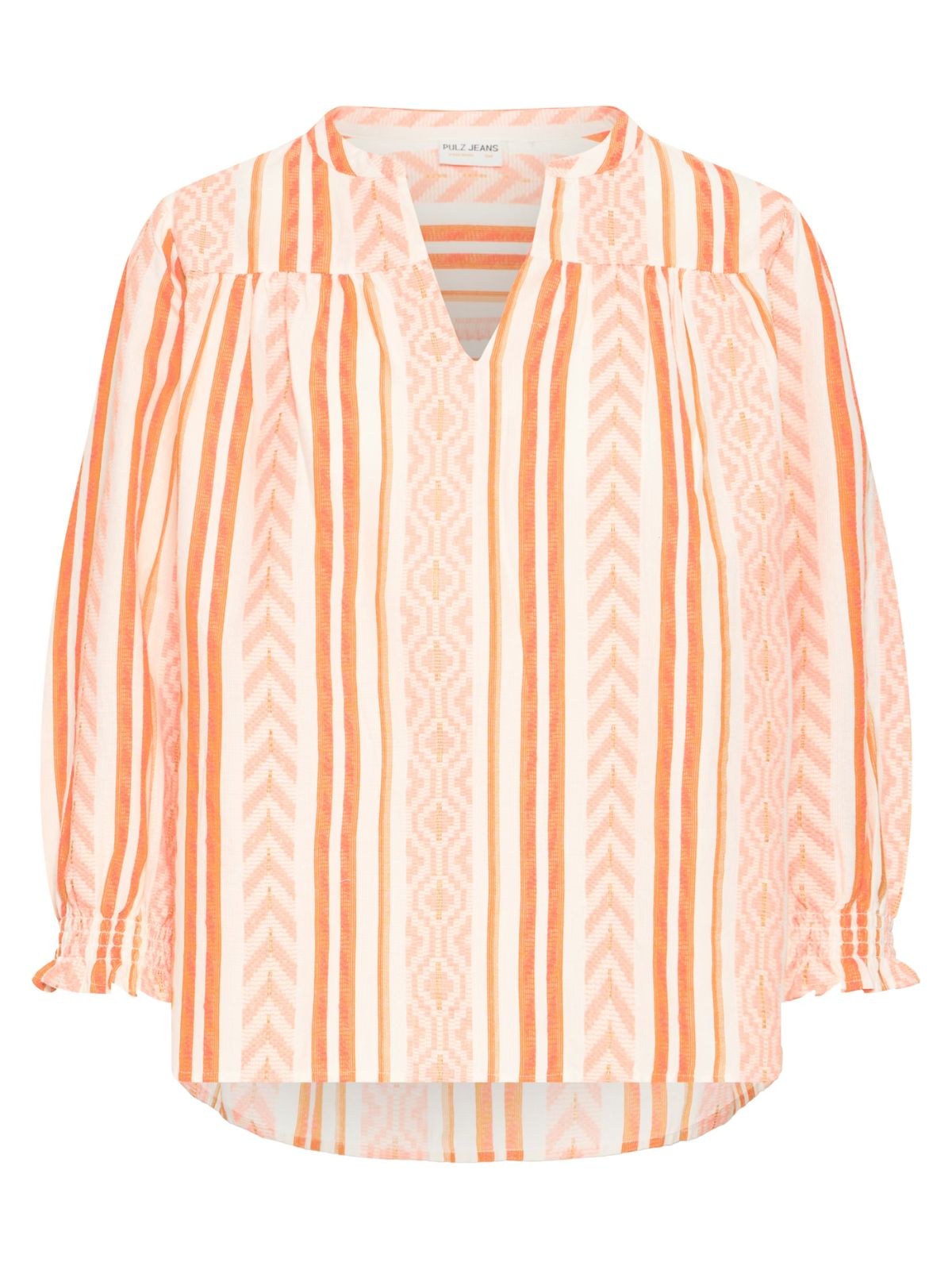 Smart bluse fra PULZ i boheme style samt i smukt mønster. Blusen har en rund hals og dyb V-udsnit, draperinger for og bag samt 3/4 lange ærmer med elastisk manchet kant.Længde: ca. 60 cm