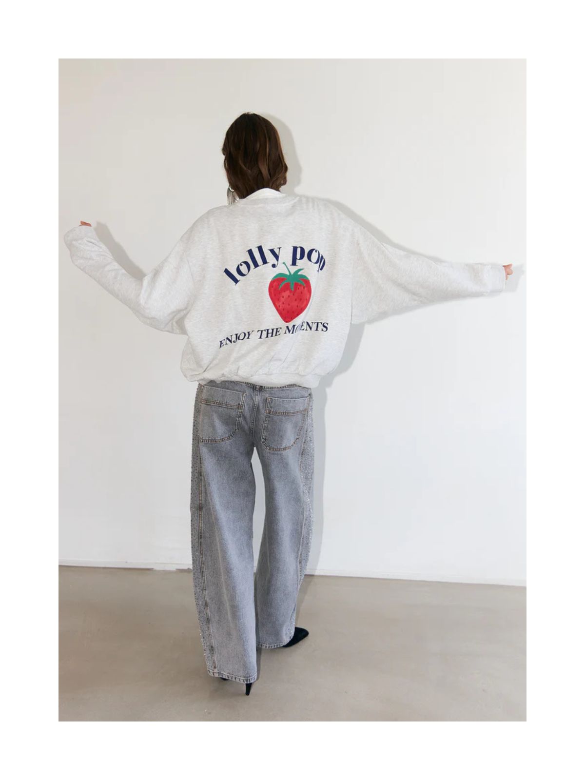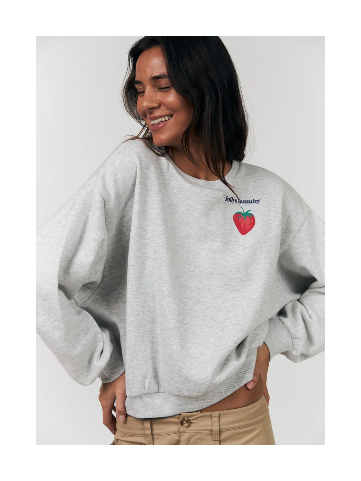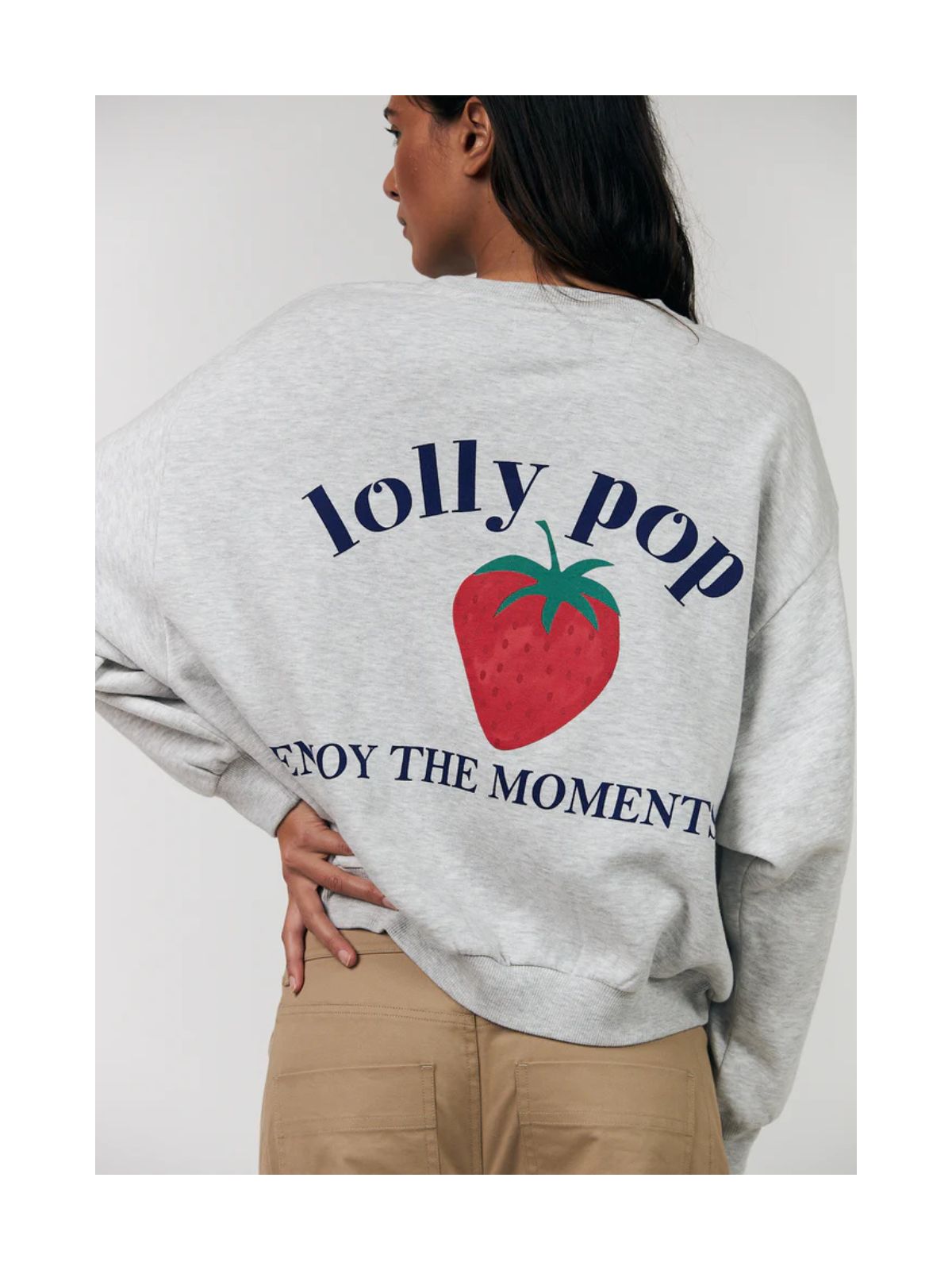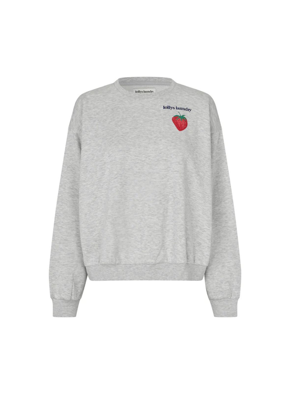 Sydney sweatshirt fra Lollys Laundry i en blød og behagelig kvalitet. Sweaten er designet i en klassisk grå melange med et jordbærprint og teksten “Lolly pop – enjoy the moments” på ryggen.Sweaten har drop skuldre, ribkanter ved manchetter, hals og bund samt et loose fit design.