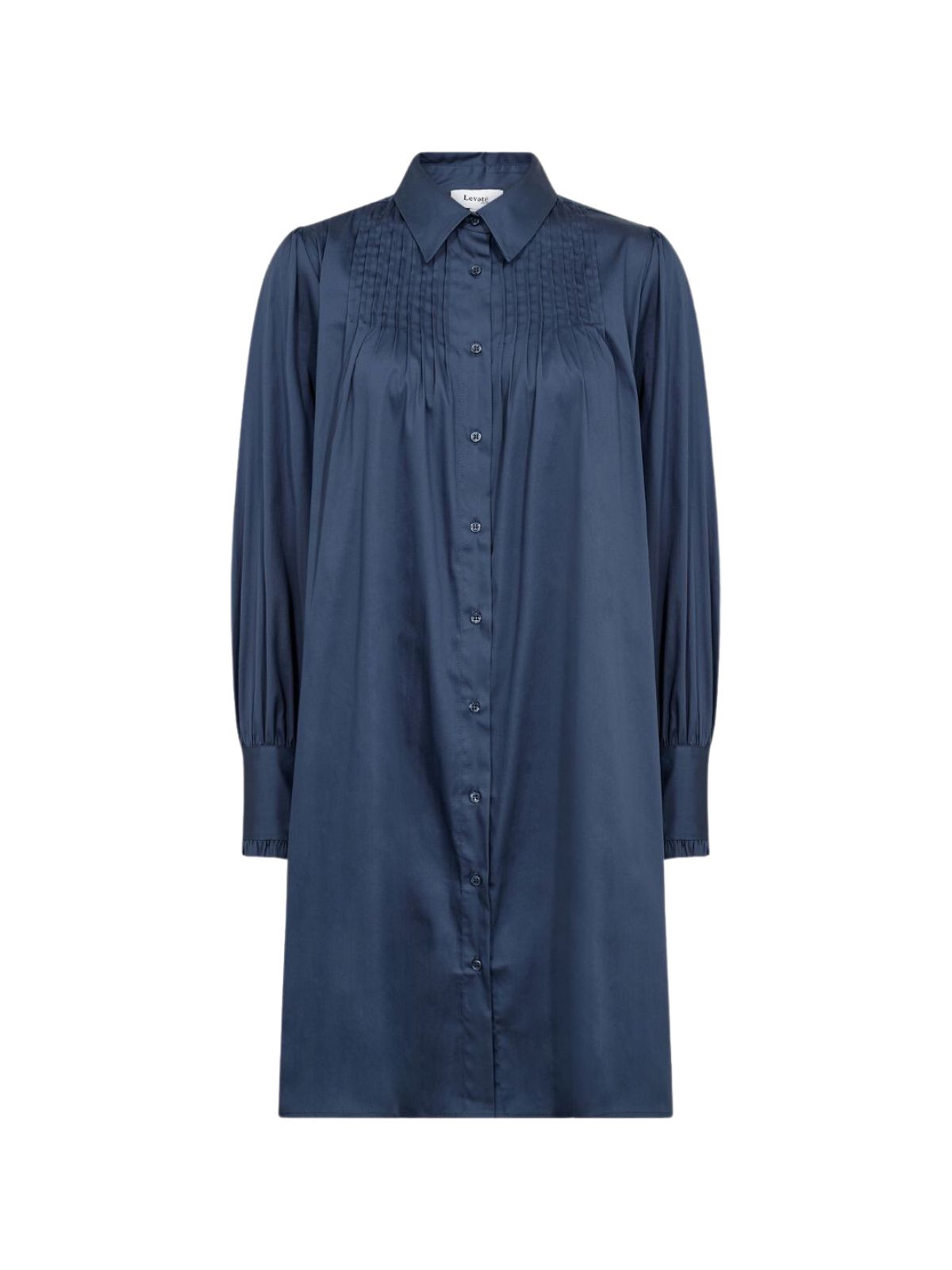Smuk skjortekjole i navy med et elegant og feminint udtryk. Kjolen har klassisk krave, fine læg ved skuldrene og gennemgående knaplukning med tone-i-tone knapper. Designet fuldendes med stiklommer i siderne samt lange ærmer med lette rynker ved skuldrene og dekorative manchetter med fin flæsekant.
