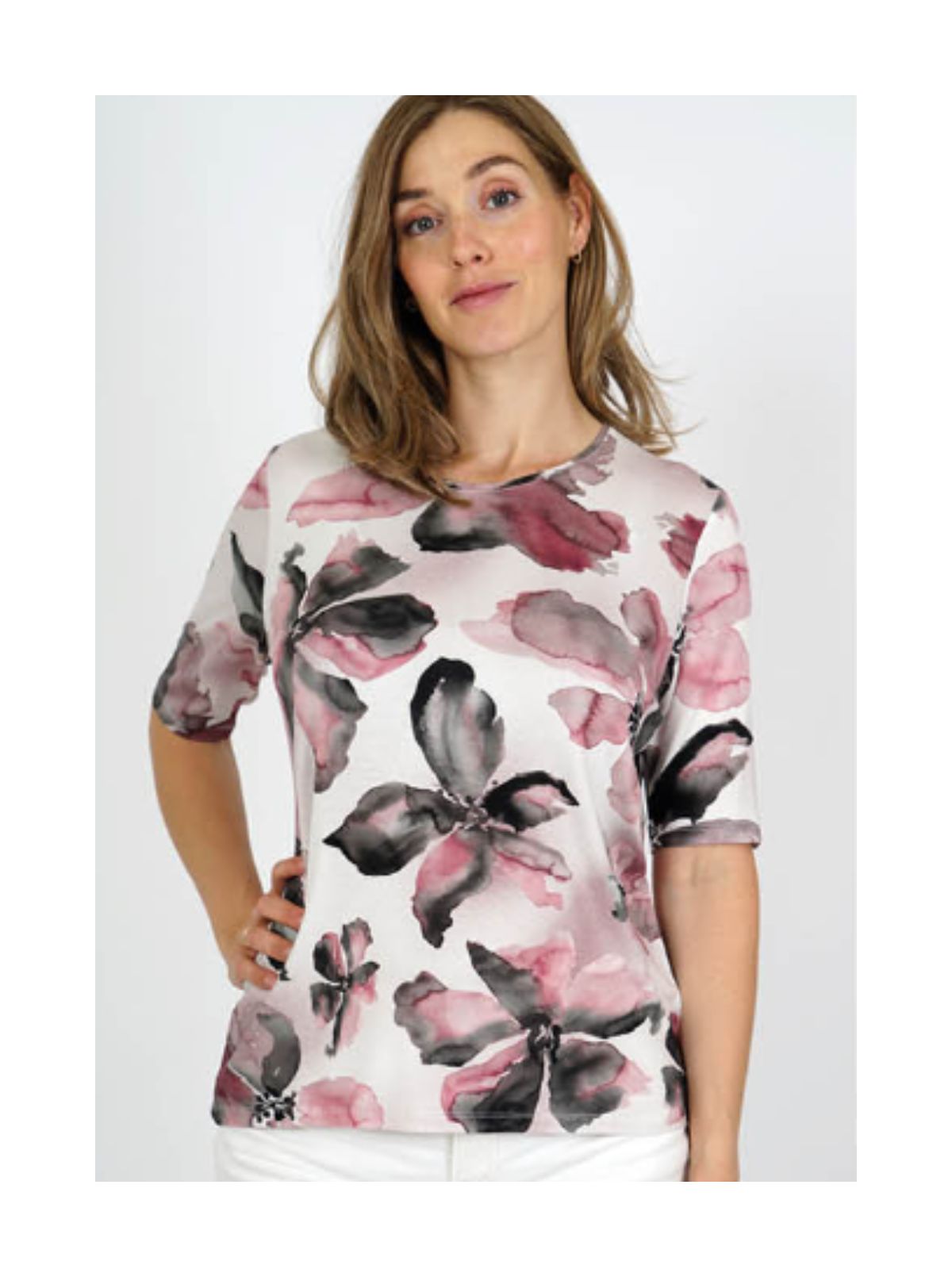 Feminin bluse fra Textil Karntner med flora print samt med rund hals og korte ærmer.Længde: ca. 60 cm