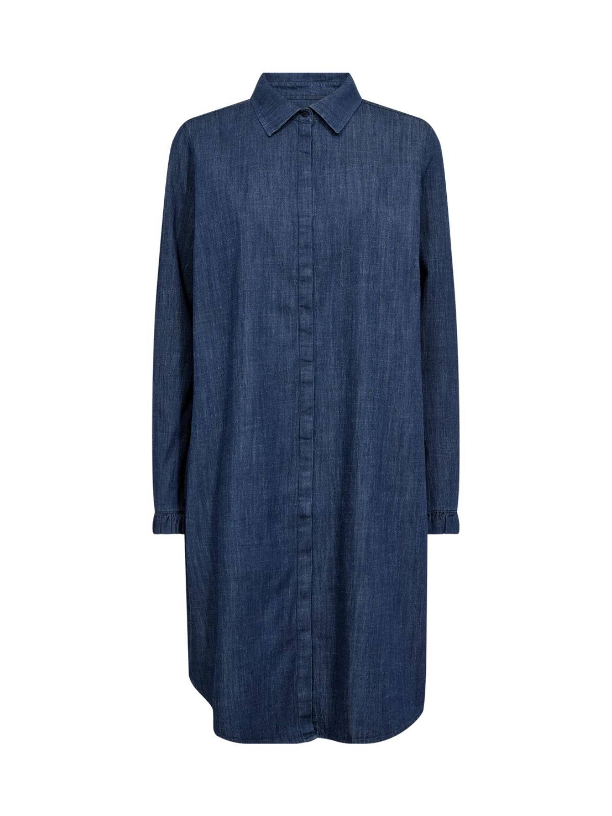 Denne denimkjole forener klassisk skrædderstil med en feminin silhuet. Den er designet i en regular pasform med klassisk krave og skjult knaplukning, som giver et rent og poleret udtryk. Det bløde denim falder flot og gør kjolen velegnet til både afslappede hverdage og mere elegante anledninger.