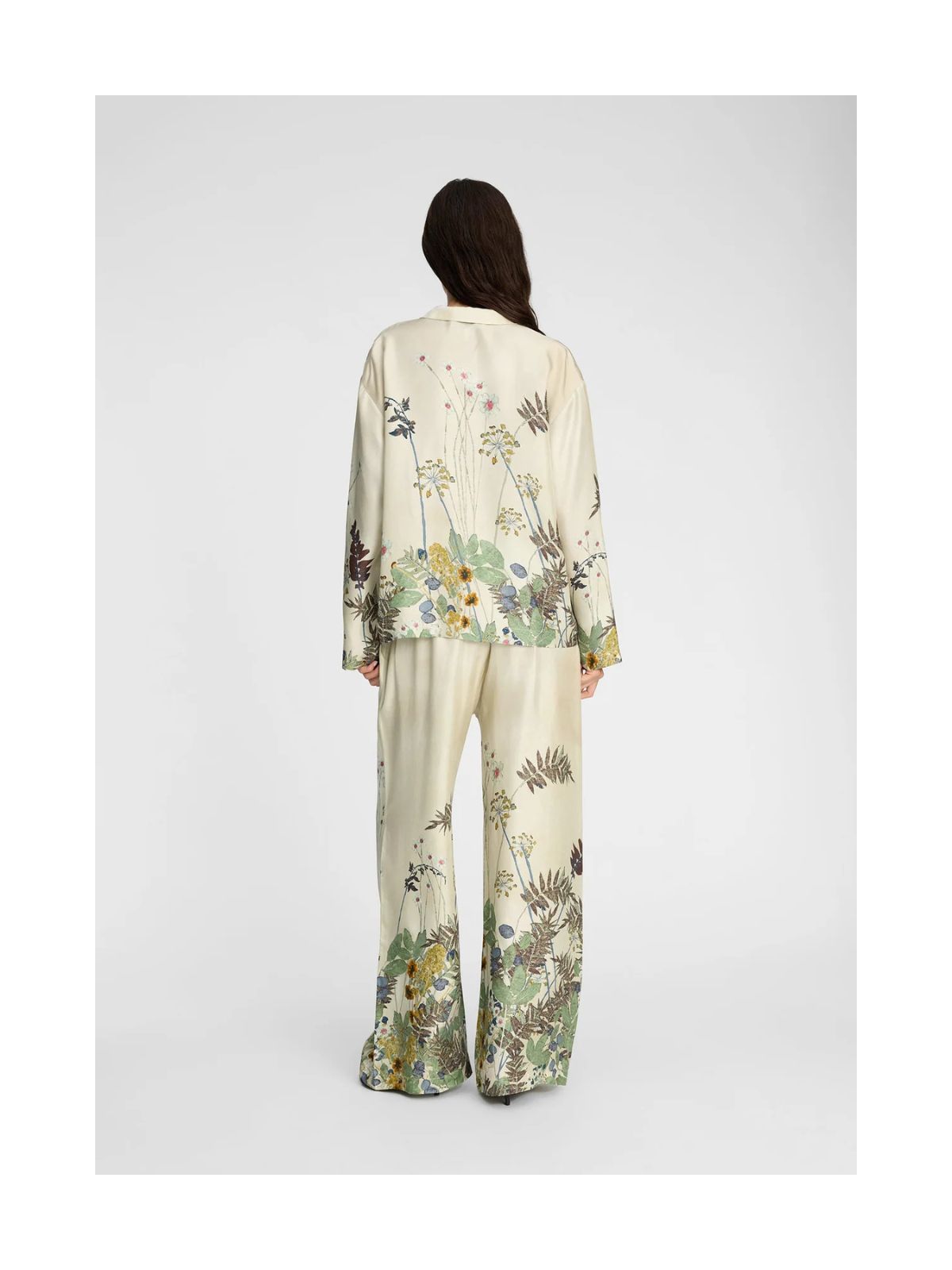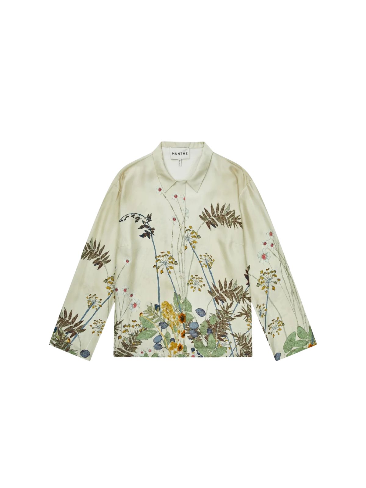 Flora bluse fra MUNTHE i 100% silke med et fint botanisk print. Blusen har lange ærmer, en klassisk krave og en afslappet pasform.Pasform: Loose Fit