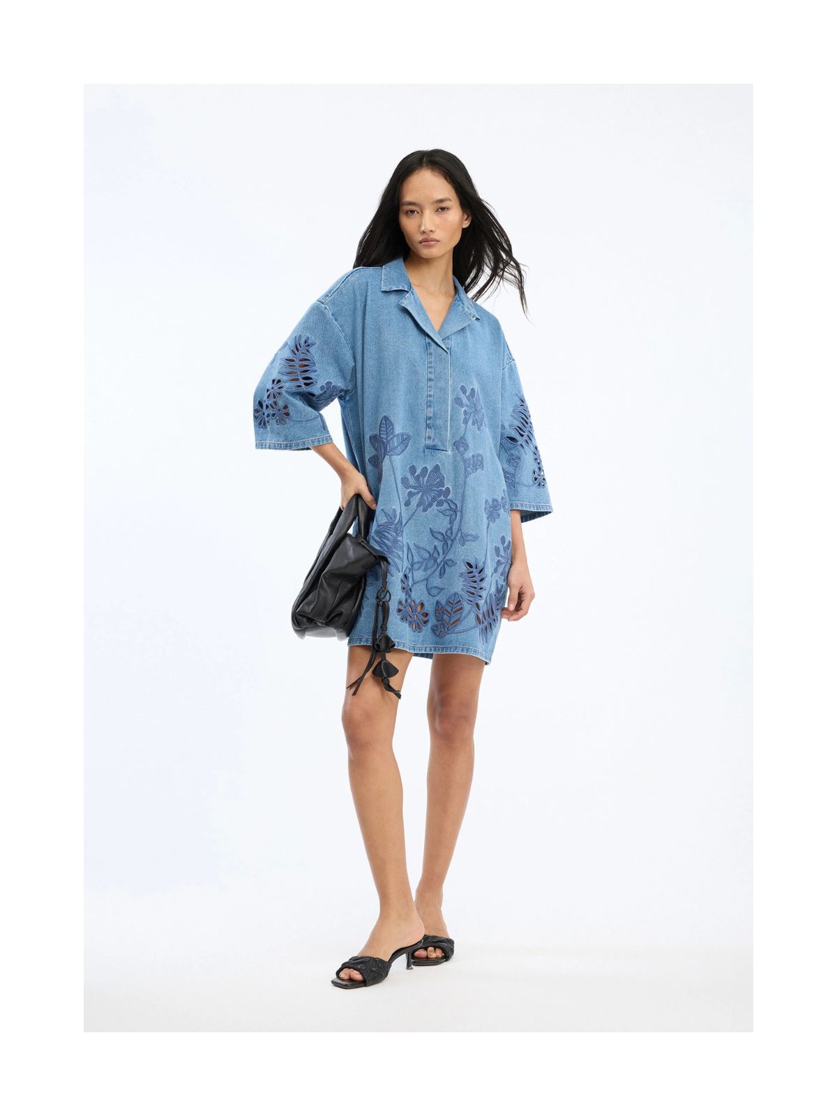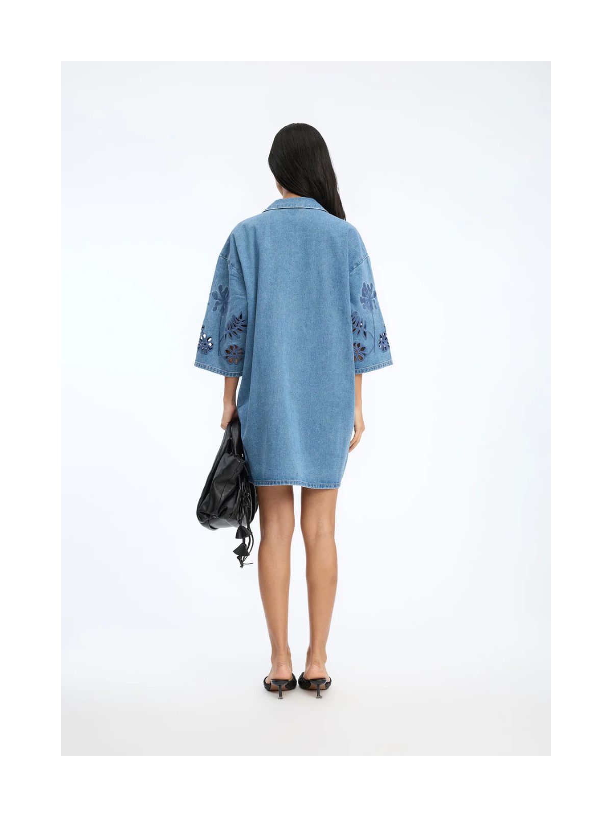 Feminin kjole fra MUNTHE i denim med tone-i-tone broderede blomsterdetaljer. Kjolen har en afslappet, lige pasform, V-udskæring med lille krave samt korte, rummelige ærmer.Længde: ca. 80 cm