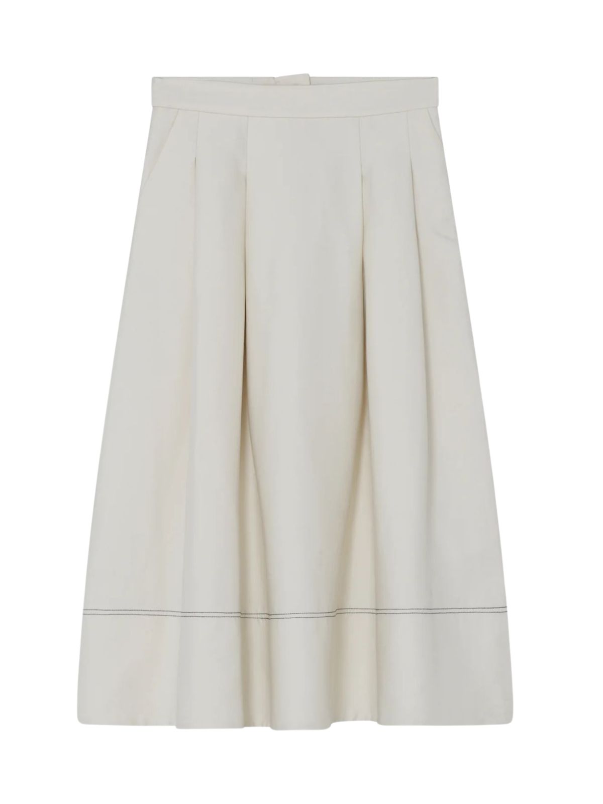 Midi A-formet nederdel med lav talje, plisseringer ved linningen og lynlåslukning bagpå. Stoffet har en let glans, der giver et skræddersyet og elegant udtryk – perfekt med en silketop for et feminint look.