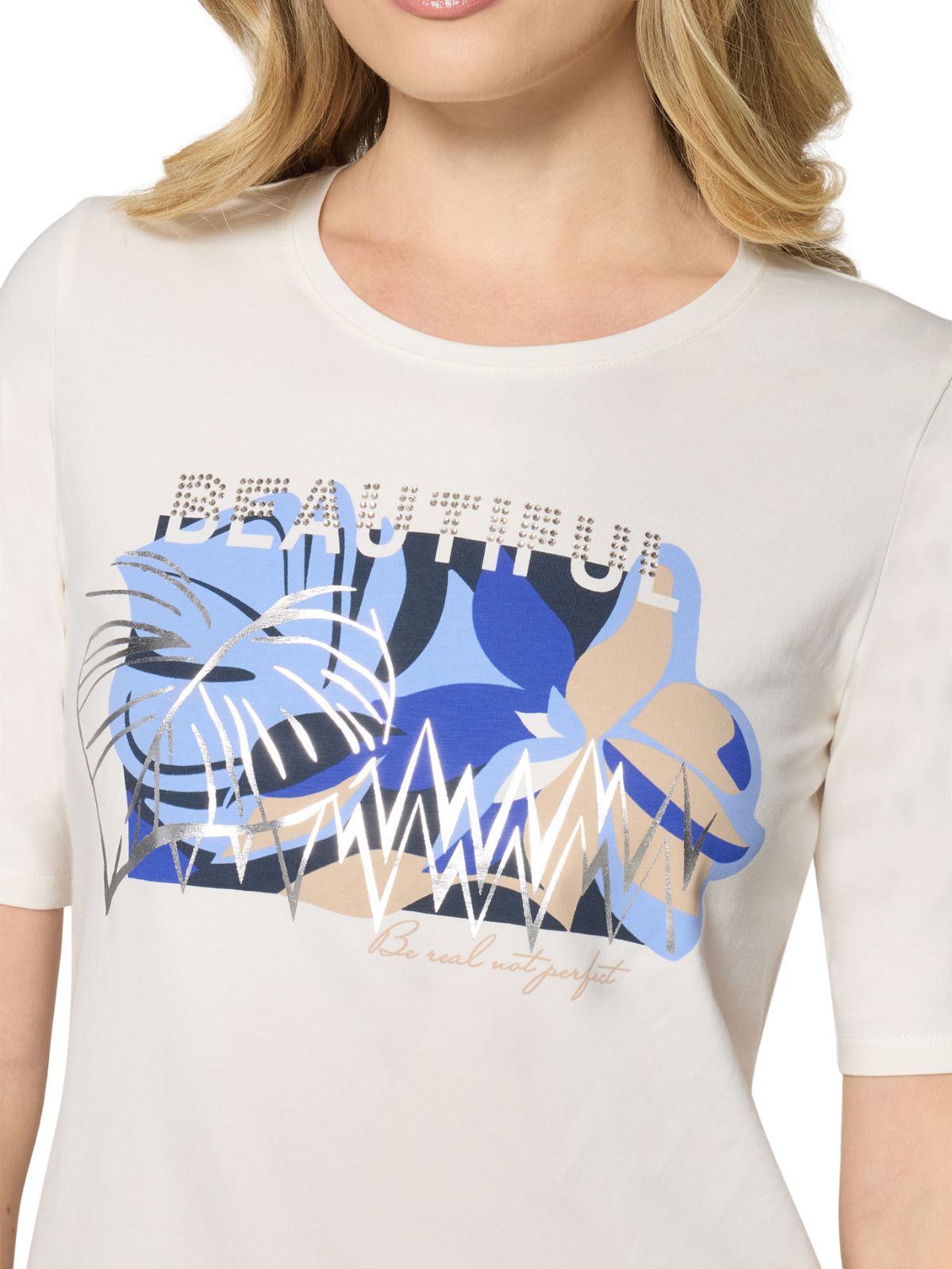 Smart bluse fra Betty Barclay med applikatiion foran. Blusen har rund hals og korte ærmer.Længde 64 cn