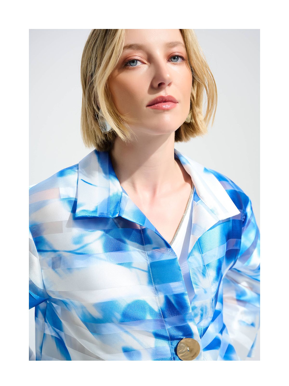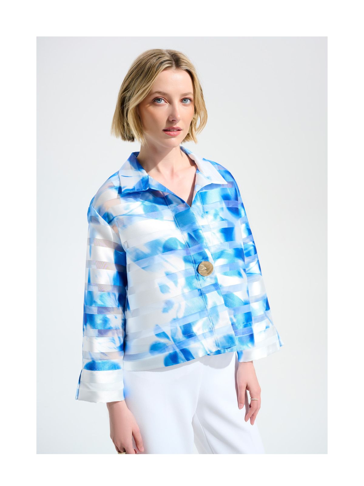 Raffineret blazer jakke med stil og komfort fra Joseph Ribkoff i let transparent design i klare farver. Jakken har et abstrakt mønster og en normal pasform, der fremhæver din silhuet. De 3/4 lige ærmer og hoftelange snit gør den til et ideelt valg til hverdagsbrug og til mere festlige anledninger samt giver din garderobe et elegant og feminint touch.Længde: ca. 66 cm