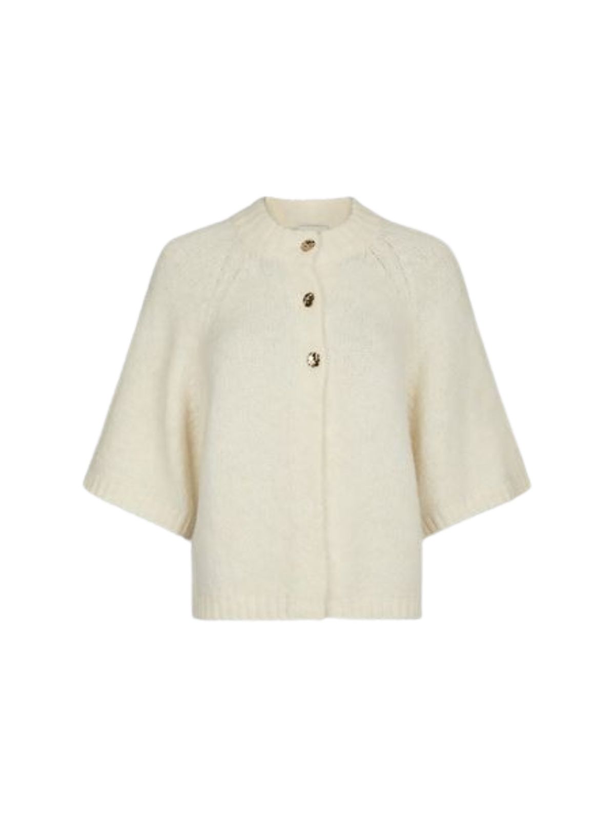 Løs cardigan fra Neo Noir i hvid med 2/4-ærmer og ribkant. Cardiganen har brede ærmer, guldfarvede knapper og knaplukning ved halsen for et elegant og afslappet look.