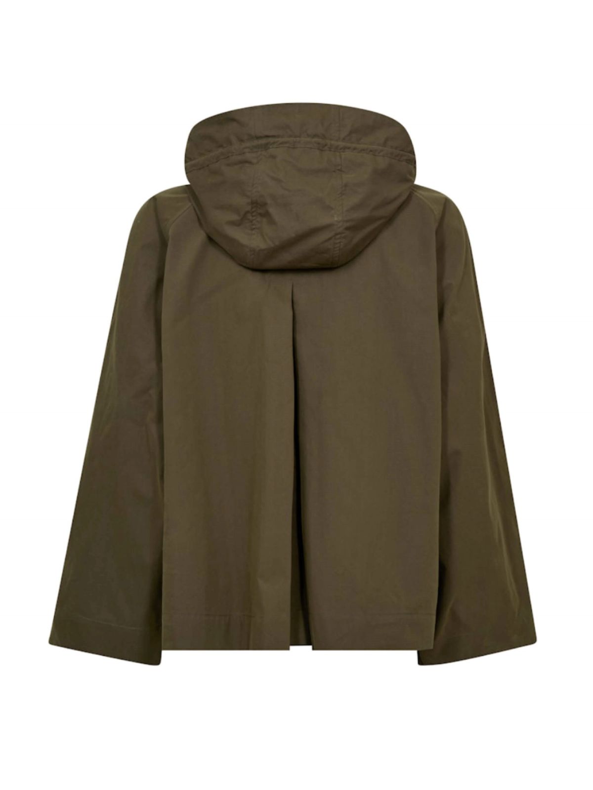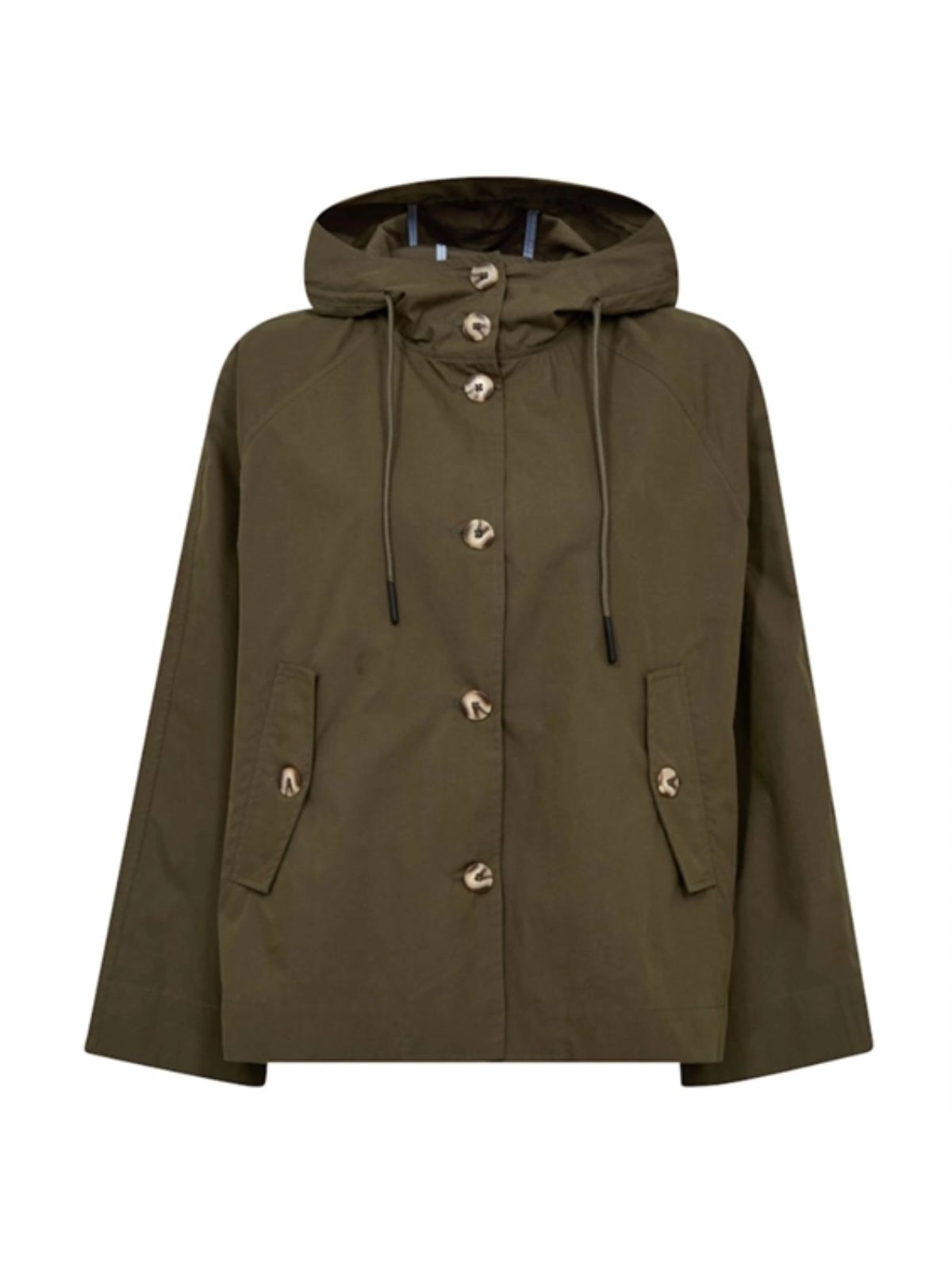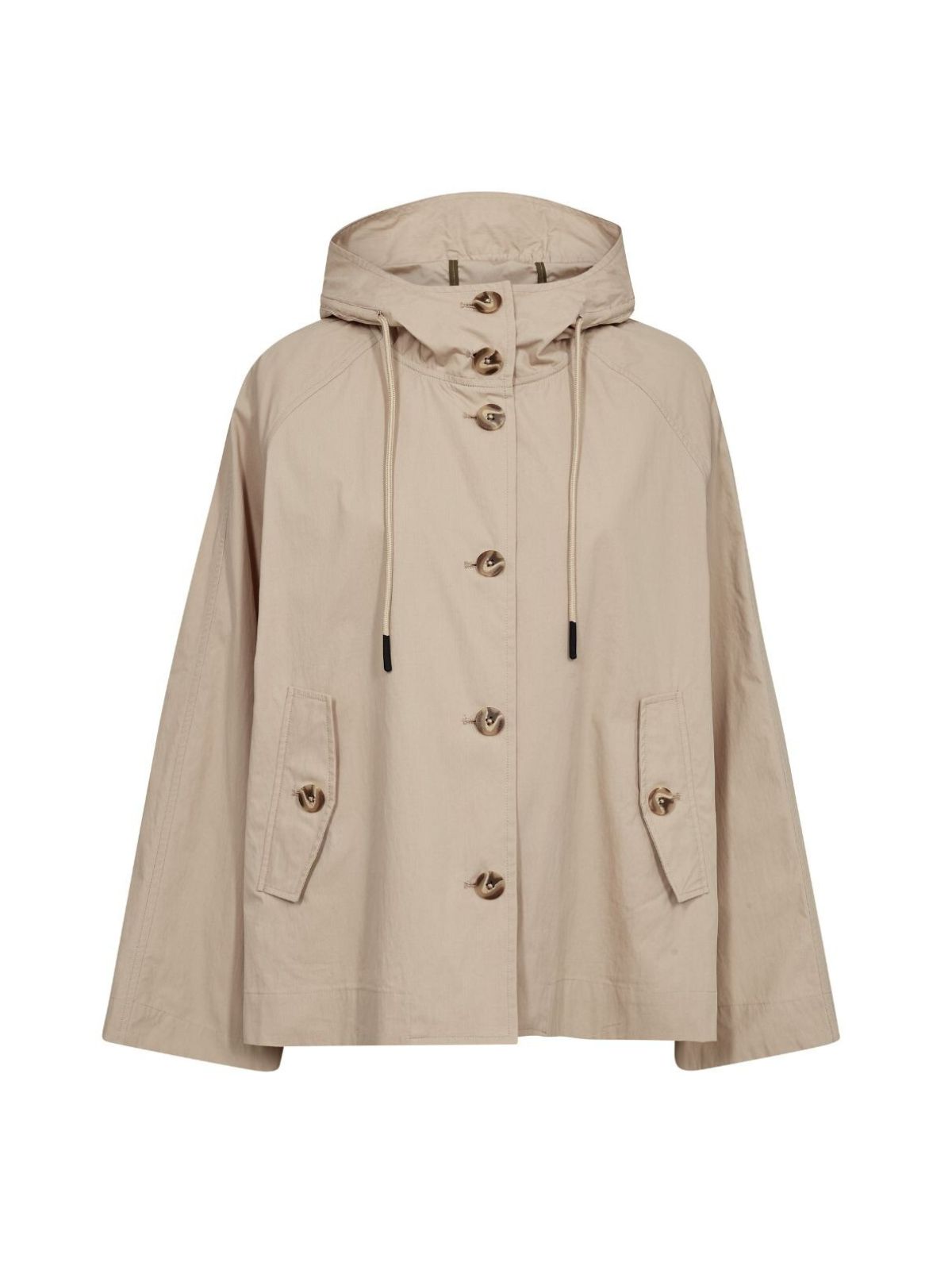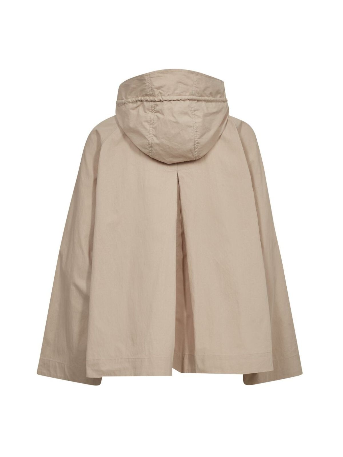Denne smukke jakke fra Mos Mosh kombinerer en elegant silhuet med funktionelle detaljer. Jakken er i lys sand og har fine hornknapper, hætte med løbegang og snøre, samt to stiklommer med flap og knap foran. Slidsene i siderne kan lukkes med knapper, mens de lange raglanærmer med vidde og wienerlægget på ryggen skaber en flatterende A-formet pasform.