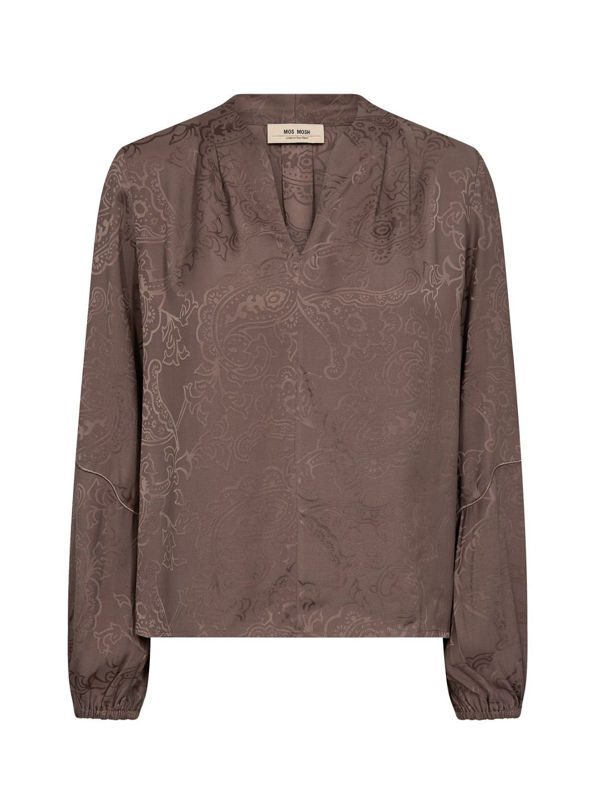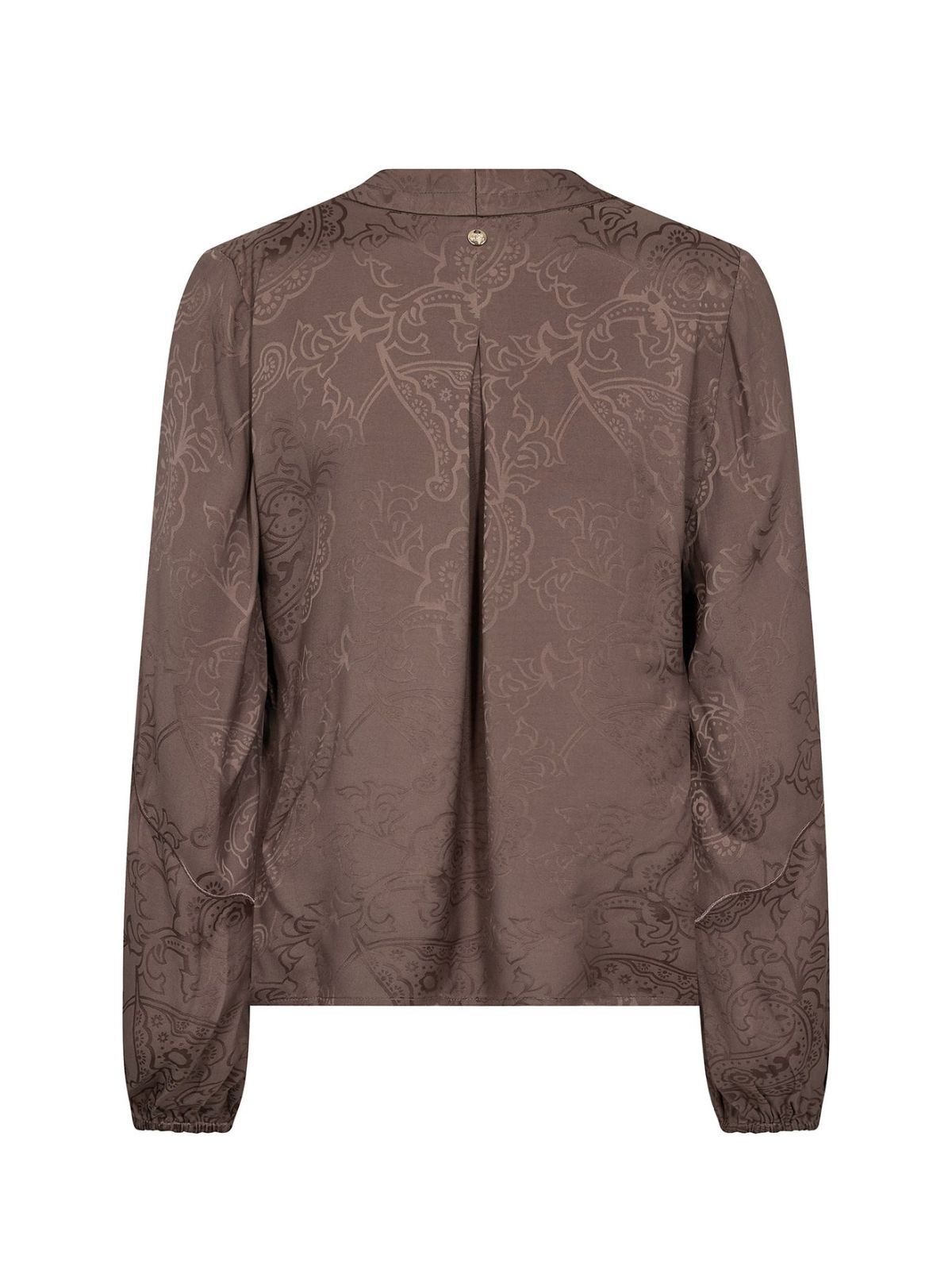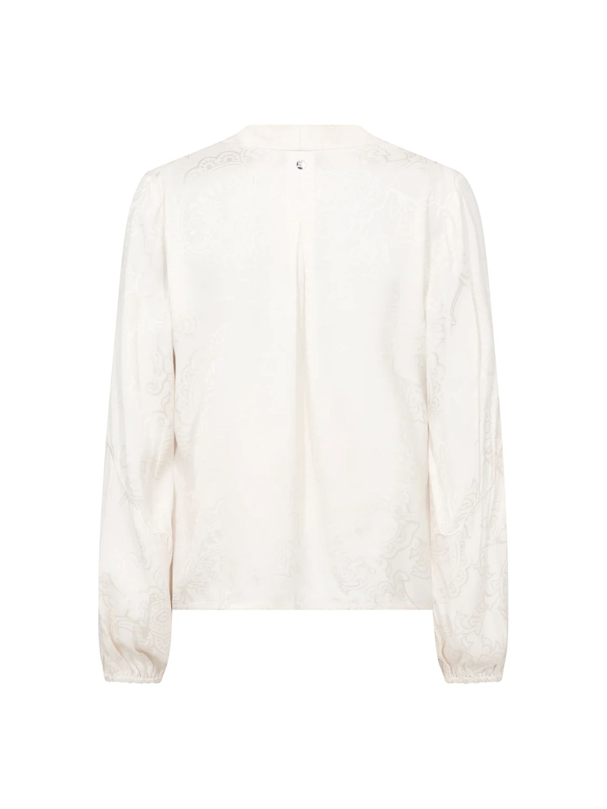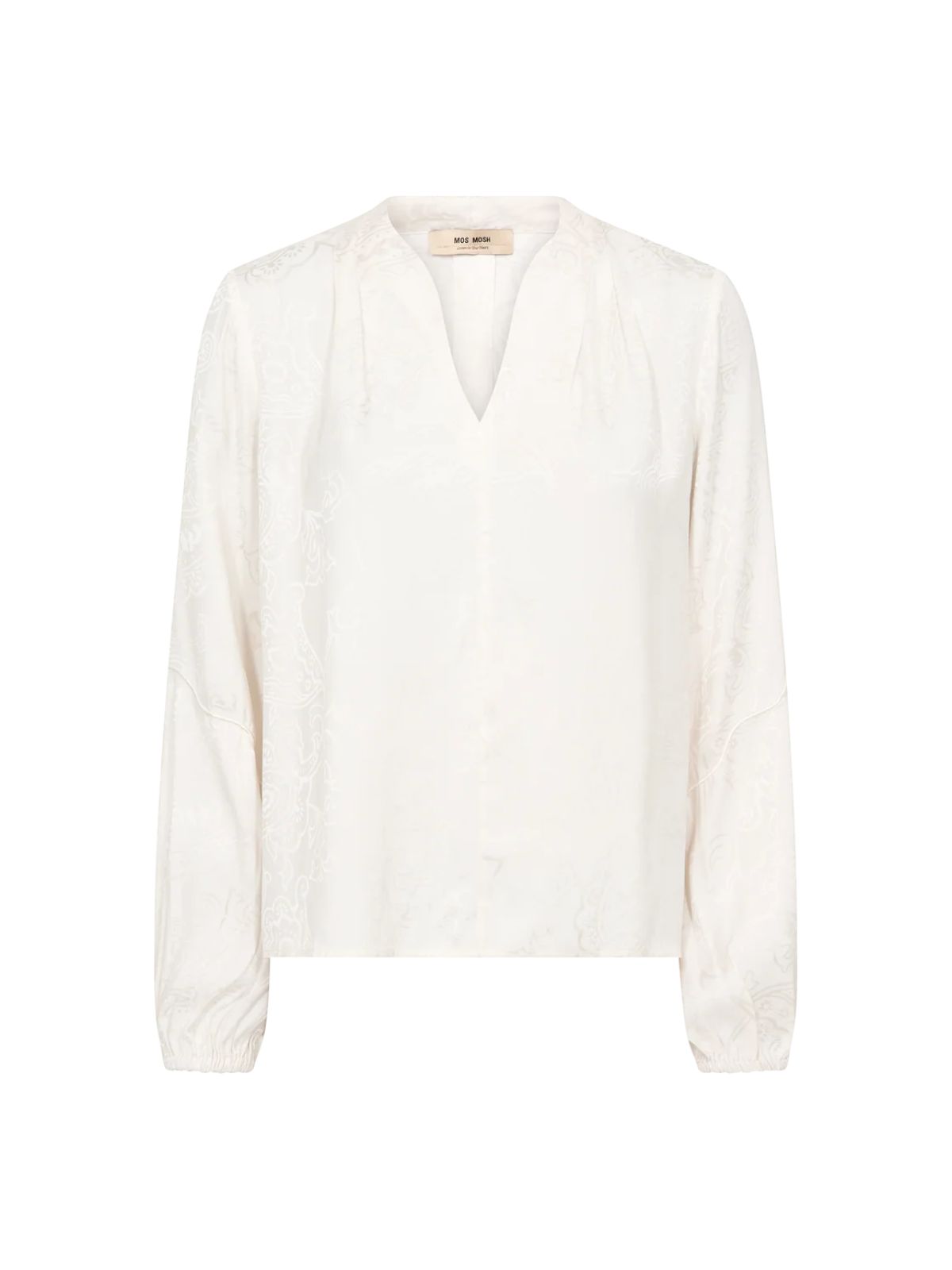 Denne elegante jacquardbluse er fremstillet i et silkeagtigt, let materiale med diskret glans, som giver et raffineret og tidløst udtryk. Blusen har V-udskæring og lange ærmer, der skaber en feminin silhuet, mens det fine vævede mønster tilfører subtil struktur. Perfekt at style med skræddersyede bukser eller nederdele for et sofistikeret hverdagslook.
