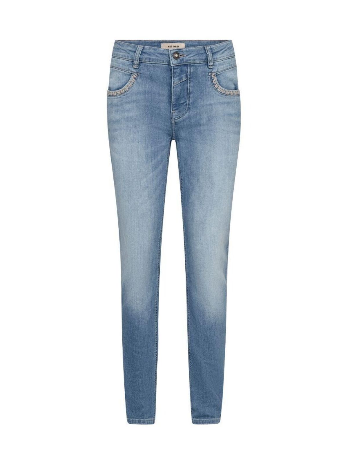 Disse super cool lyseblå Naomi Salute-jeans fra Mos Mosh kombinerer komfort med et moderne, vasket look. Fremstillet i blød kvalitet med masser af stretch, har de linning med bæltestropper, dekorativ knap og lynlås. Frontlommerne er kantet med fine broderier, og de to baglommer fuldender det stilfulde design. Perfekte at style med opsmøgede bukseben og sandaler for et afslappet, trendy udtryk.