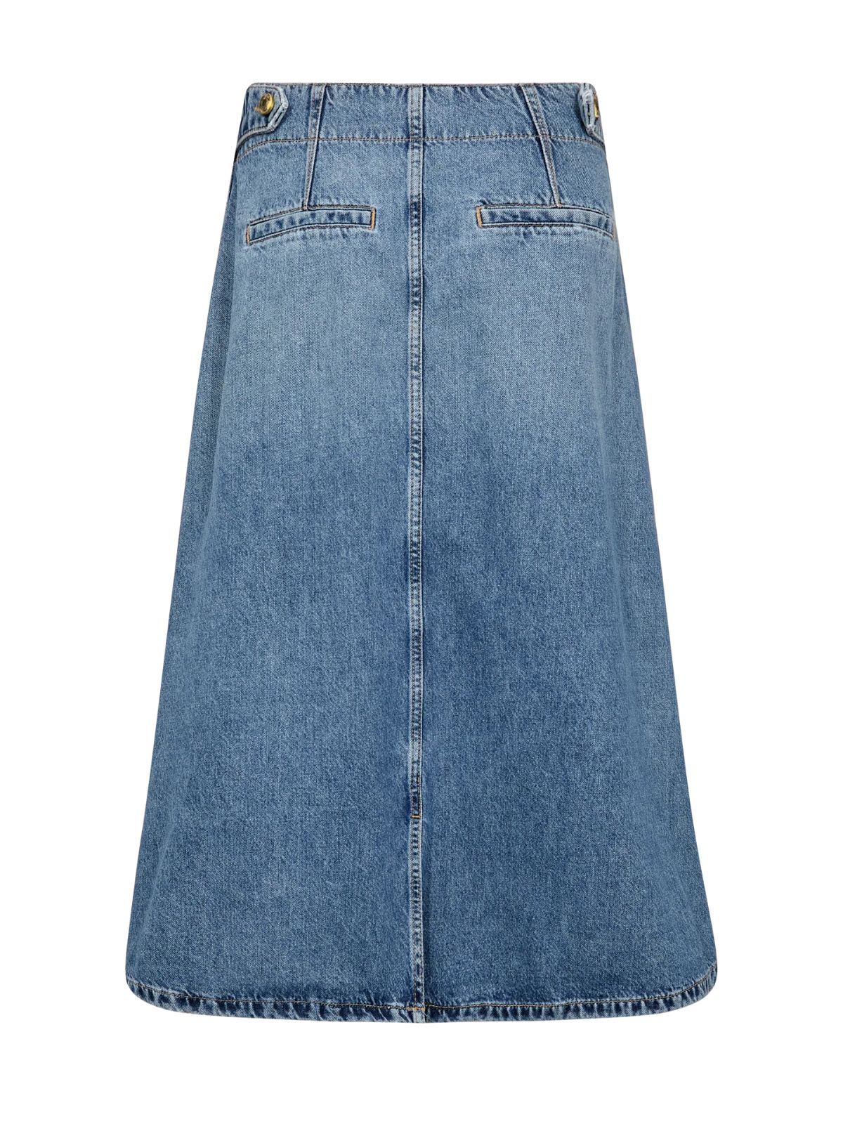 Feminin tidløs klassisk A-formede denimnederdel fra Mos Mosh fremstillet i ren bomuld for et struktureret og holdbart udtryk. Nederdelen er designet med en flatterende mellemhøj talje og skjult knap- og lynlåslukning, der giver et rent og alsidigt look – perfekt at style med en sprød skjorte eller en afslappet strik.Længde: Midi