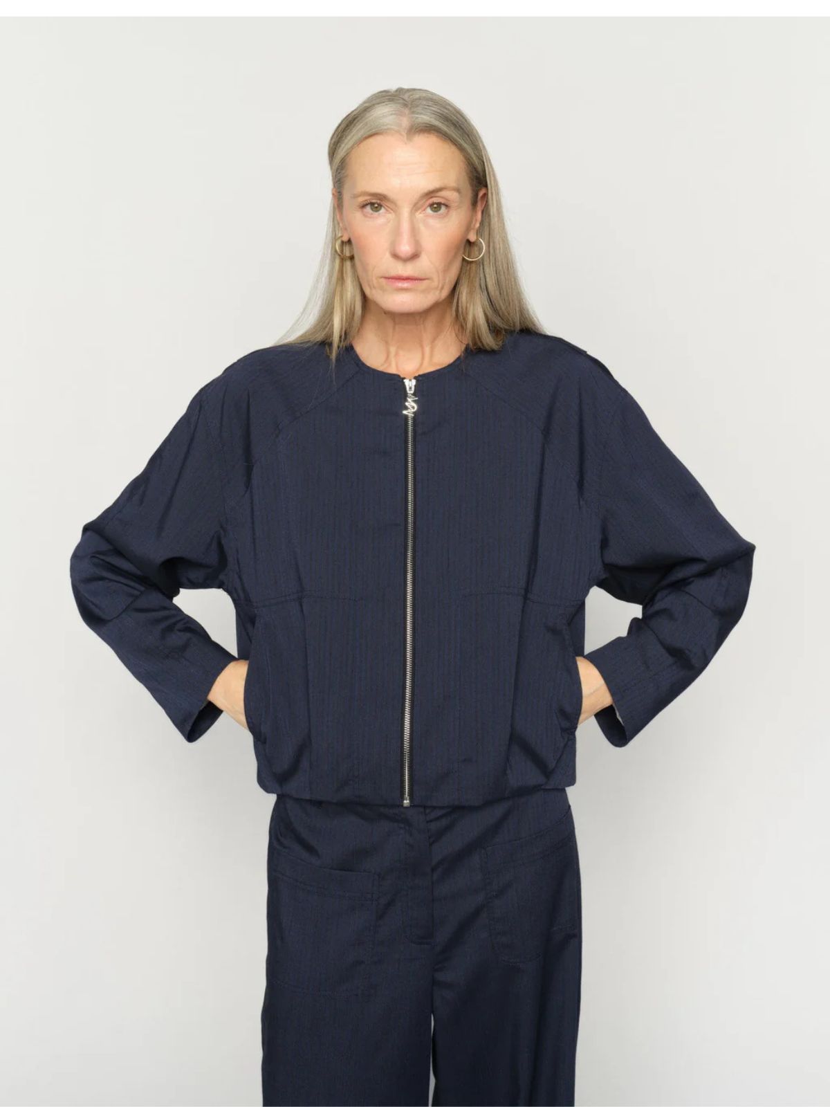 Feminin kort blazer jakke i klassisk bombersilhuet fra MOS MOSH fremstillet i en genanvendt polyesterblanding. Blazerjakken er designet i en afslappet pasform med lange ærmer og elegant lynlåslukning samt fine stribedetaljer tone i tone, der tilfører en raffineret struktur. Style blazerjakken med jeans for et afslappet look eller med skræddersyede bukser for et ubesværet sofistikeret udtryk.Længde: ca. 65 cm