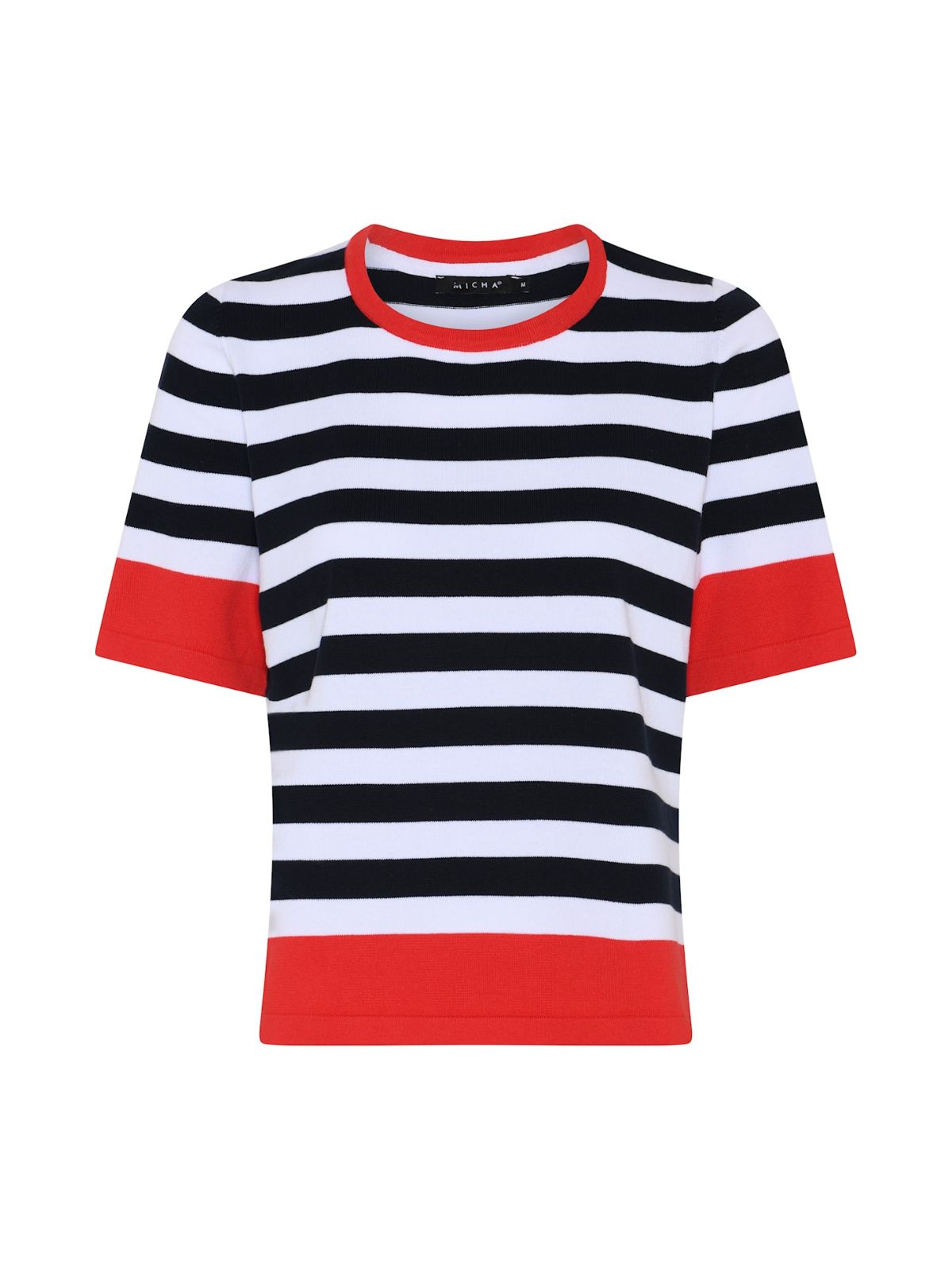 Smart strikbluse fra MICHA i friske farver og striber. Blusen har en rund hals samt korte ærmer.Længde: ca. 60 cm