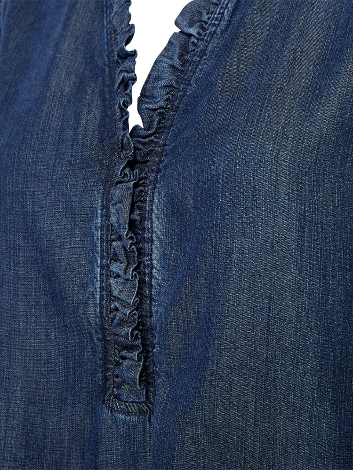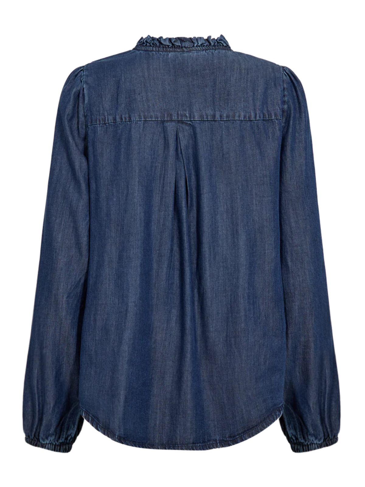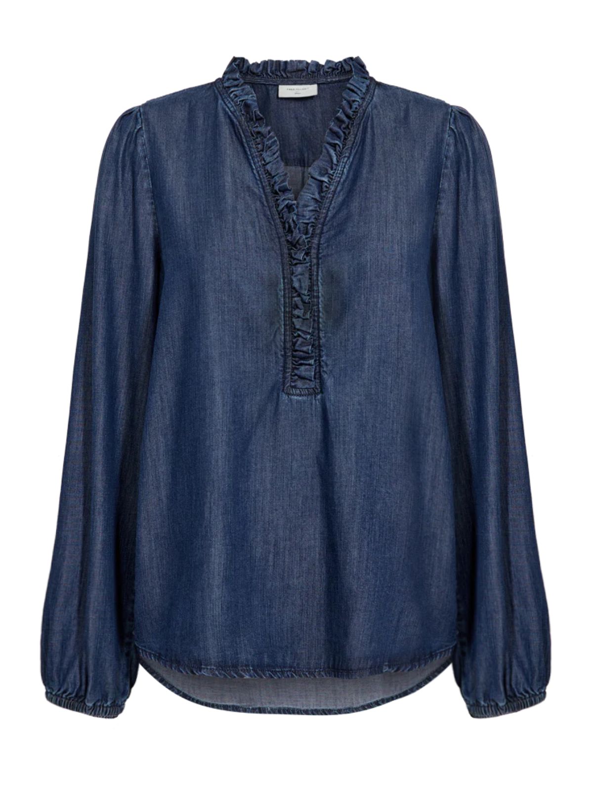 Smart bluse fra Freequent i en let denimkvalitet. Blusen har en casual pasform, V-udskæring med flæsekant, læg på ryggen for ekstra komfort samt ballonærmer med elastik manchetter.Længde: 65 cm