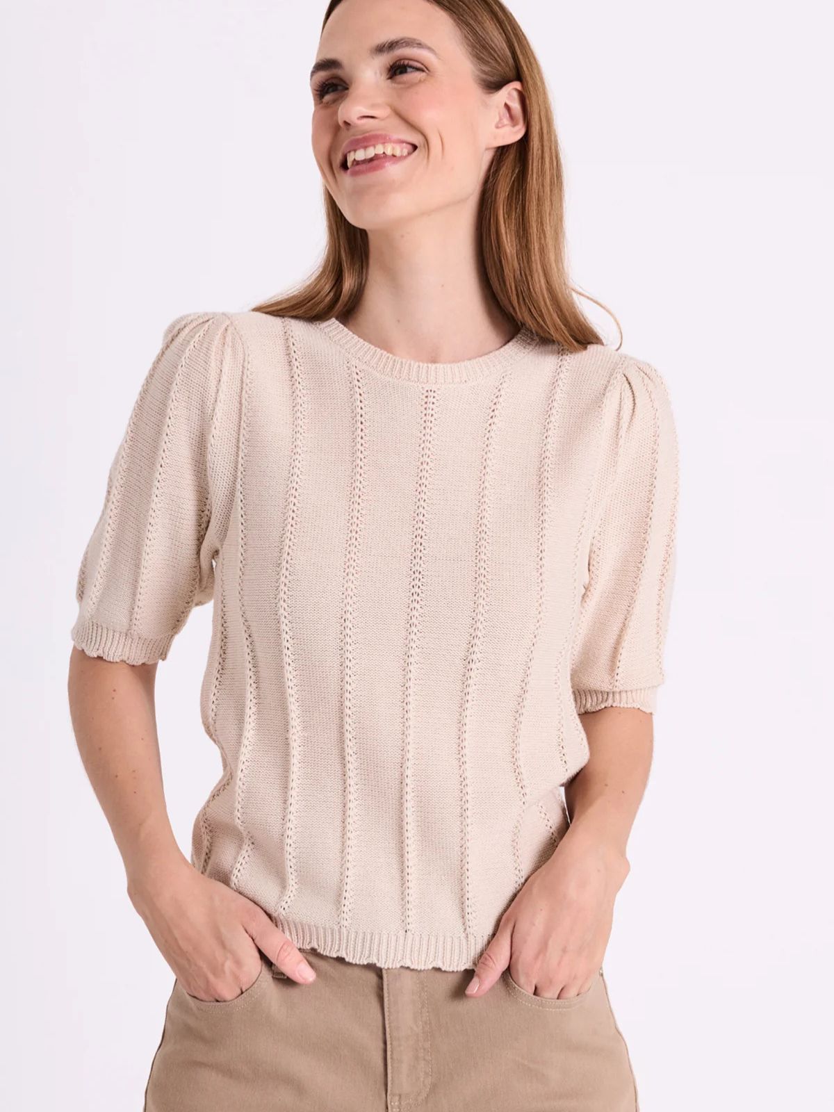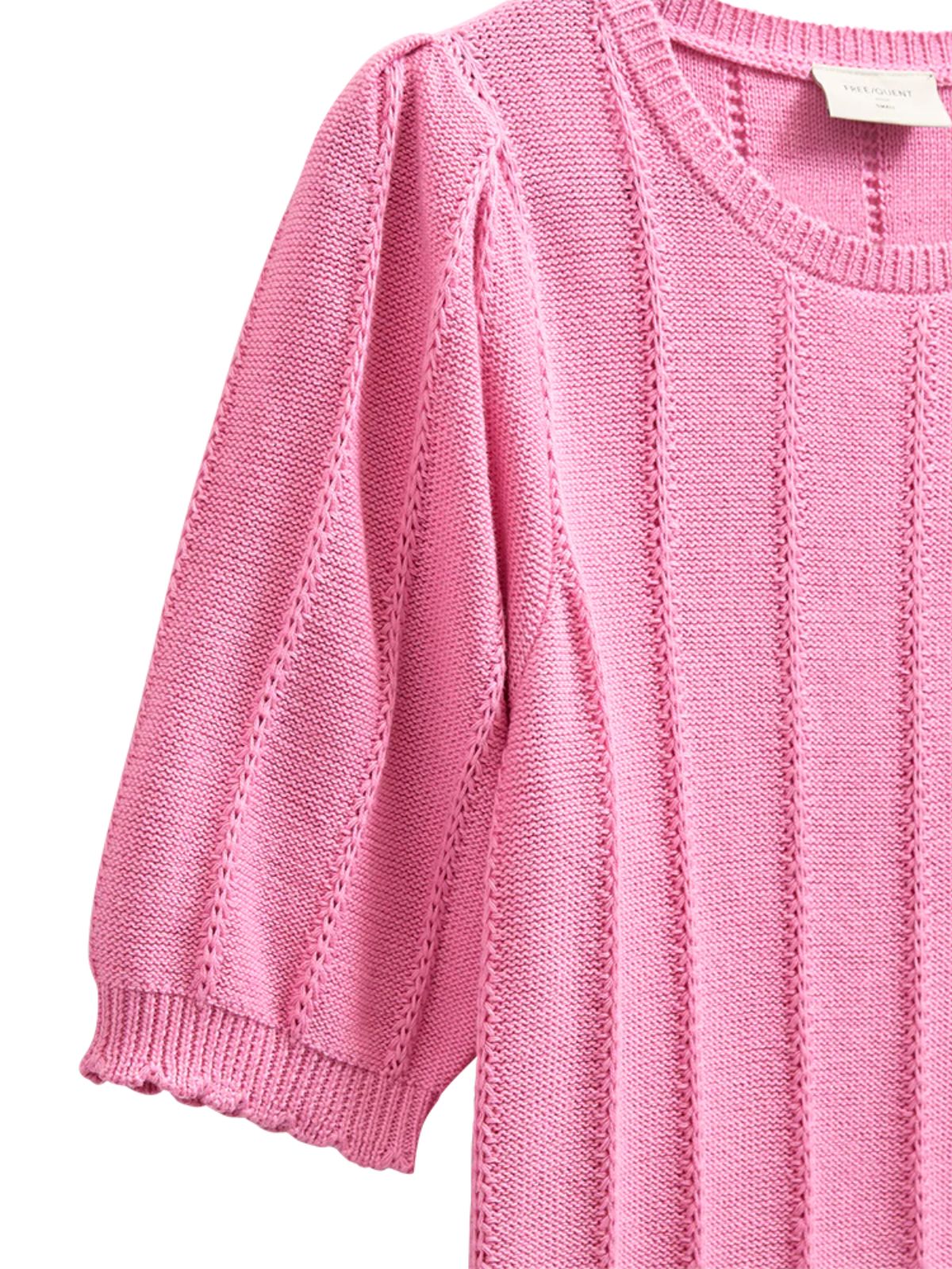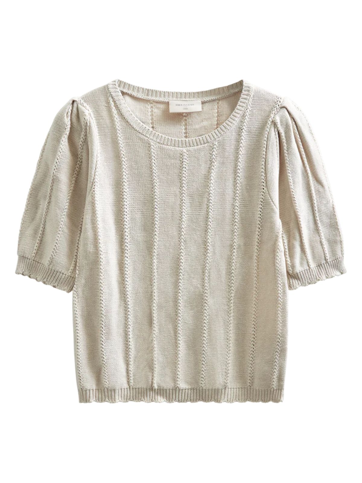 Feminin strik bluse fra Freequent i en strikket kvalitet med et broderet effekt flettet mønster. Strik blusen er enkel i modellen med trekvartlange puf ærmer med læg på skuldre, en rund halsudskæring samt ribkant med bølgekanter.Længde: 60 cm