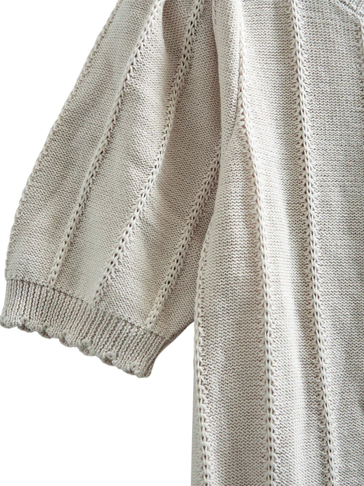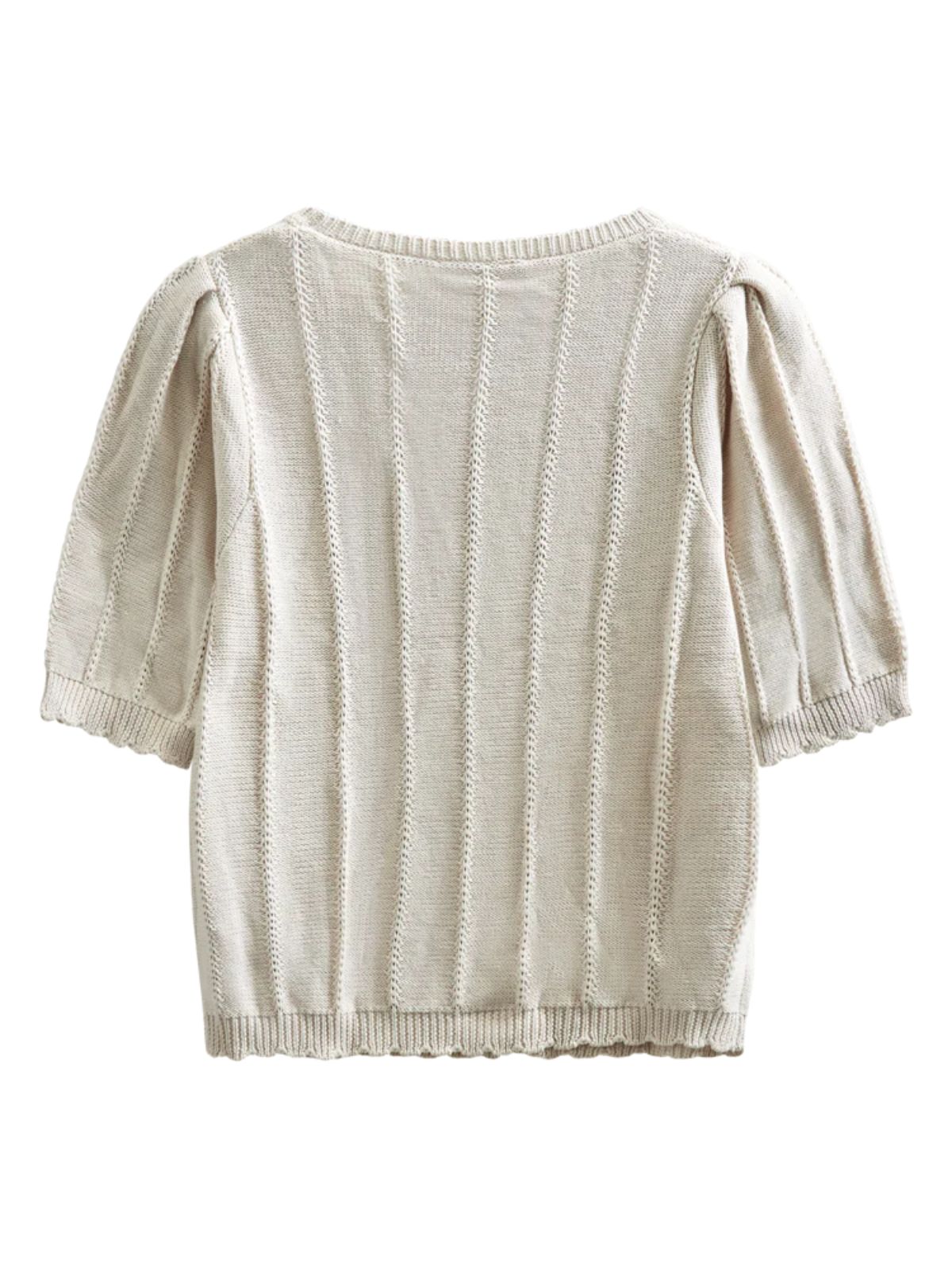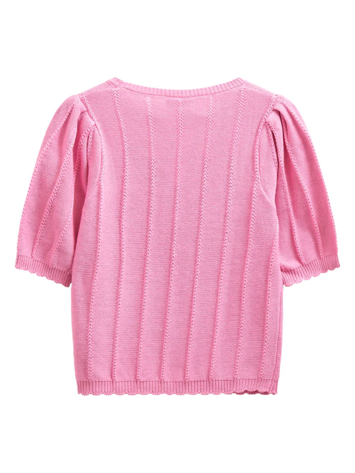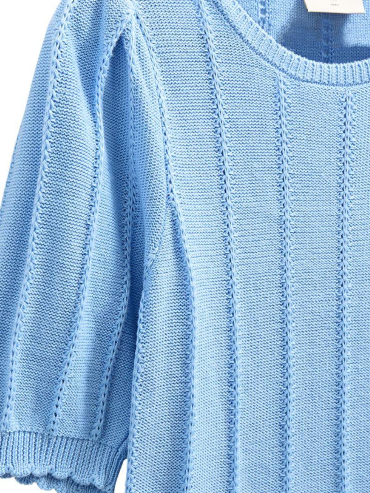 Feminin strik bluse fra Freequent i en strikket kvalitet med et broderet effekt flettet mønster. Strik blusen er enkel i modellen med trekvartlange puf ærmer med læg på skuldre, en rund halsudskæring samt ribkant med bølgekanter.Længde: 60 cm