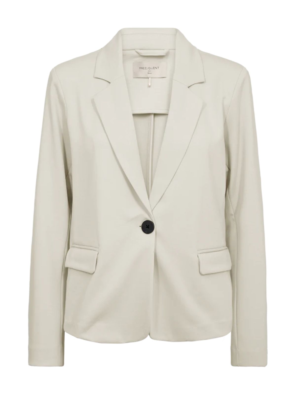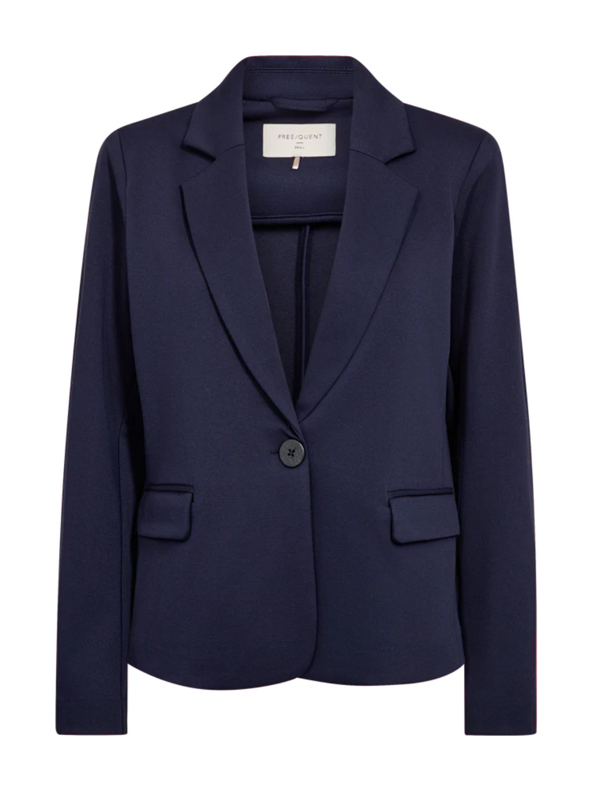 Sporty blazer jakke fra Freequent i en blød og stretchy kvalitet. Jakken er enkel i modellen med knaplukning, lange ærmer, V-udskæring med revers, sidelommer samt en elegant, figursyet facon.Længde: ca. 60 cm