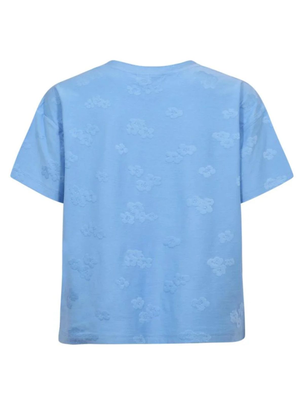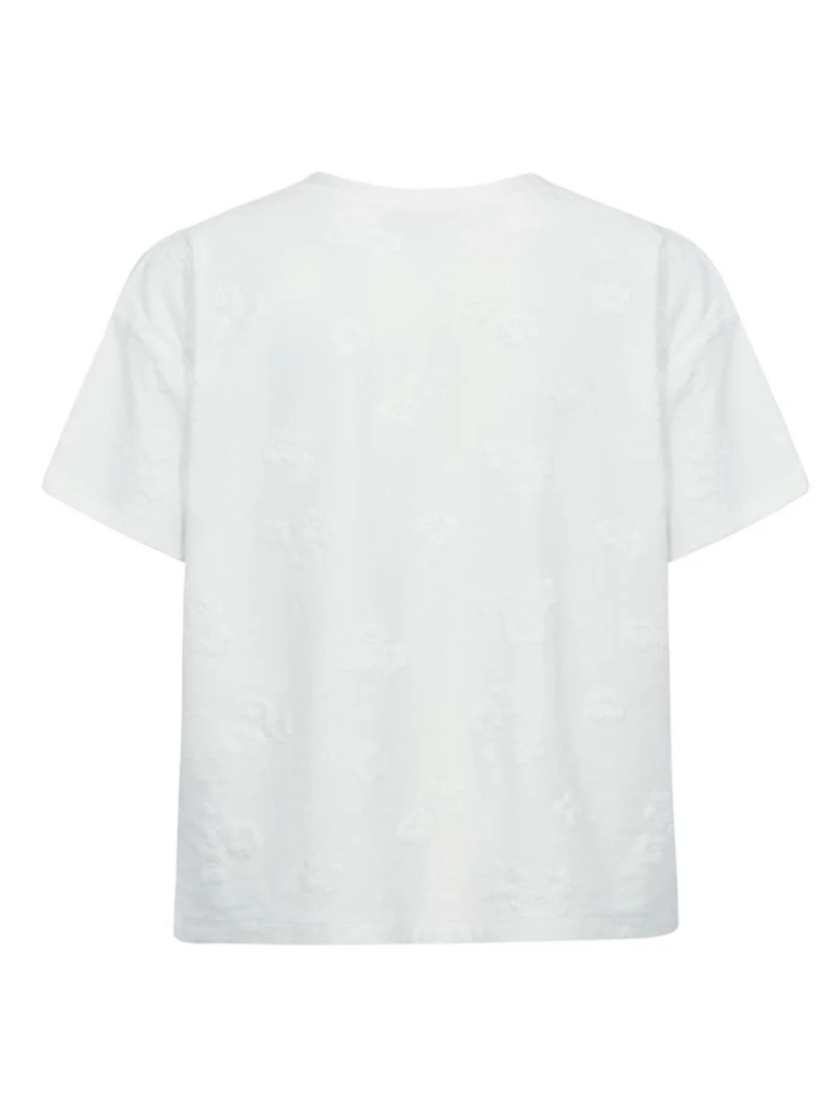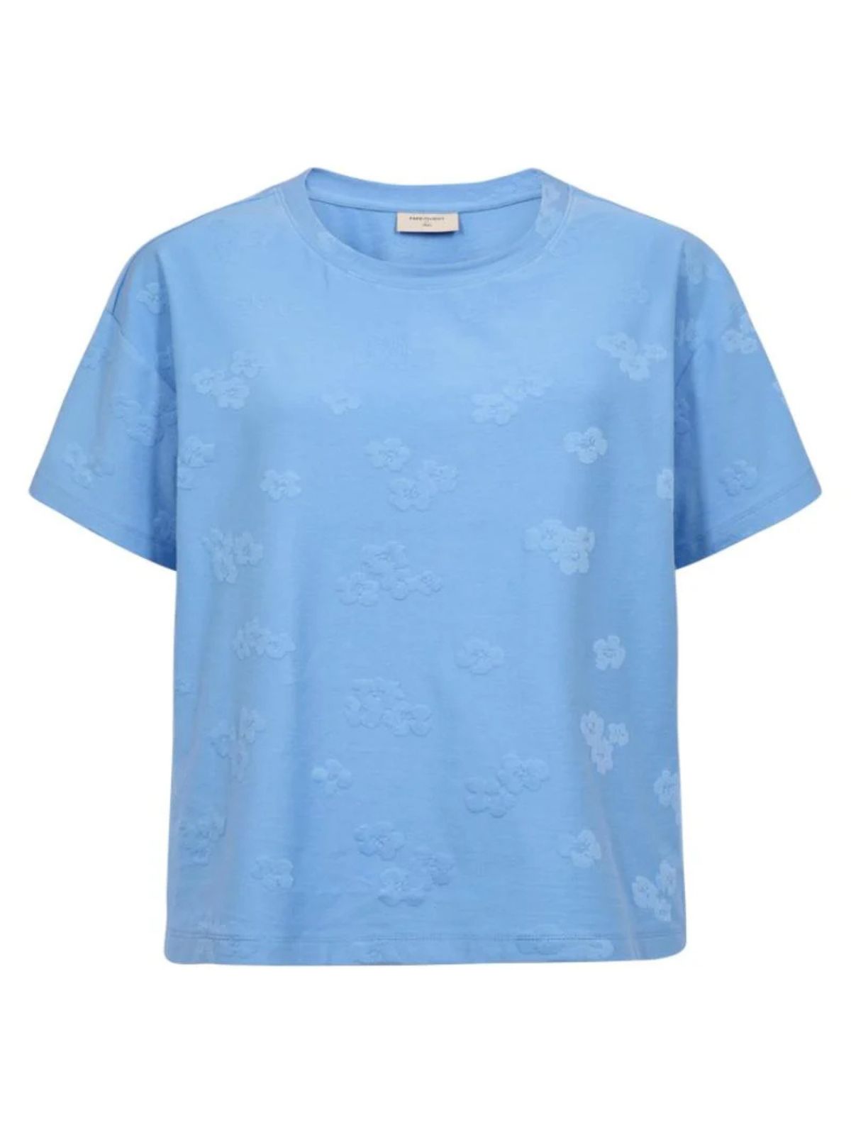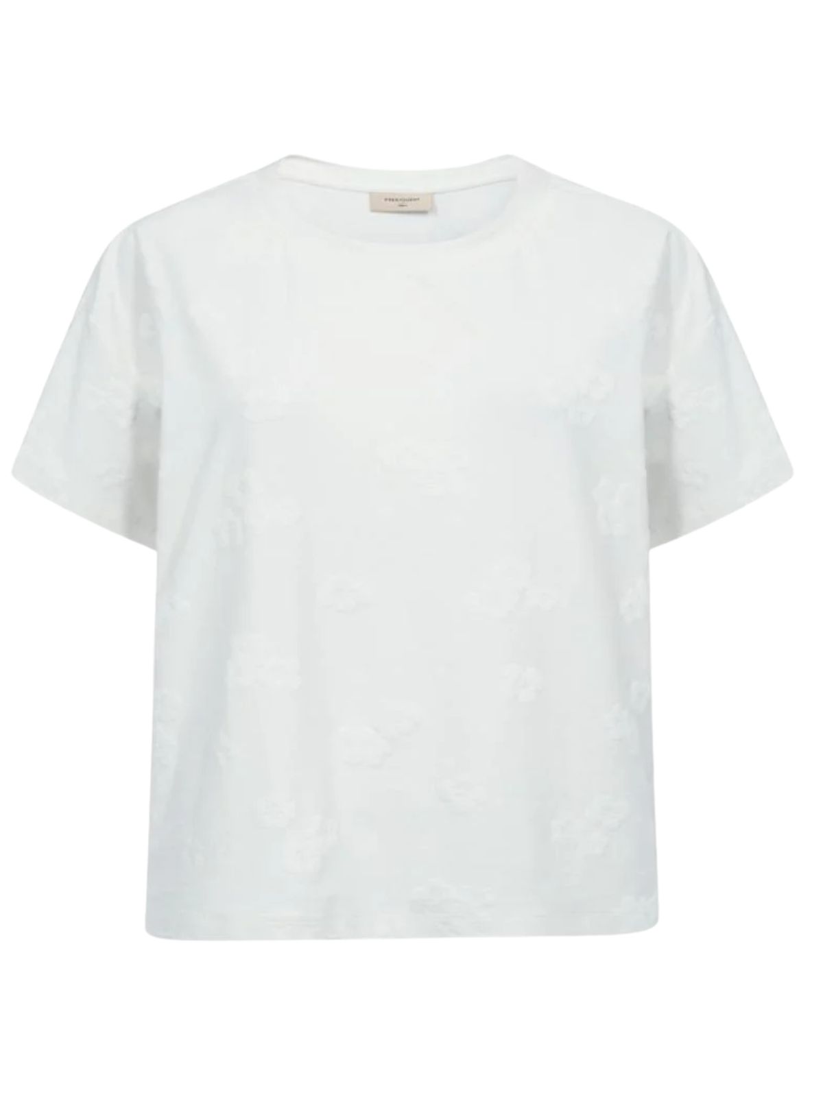 Feminin T-shirt fra FREEQUENT med jaquard vævede blomster tone i tone mønster. Blusen har rund hals, et lige snit smat korte ærmer.Længde: ca. 60 cm